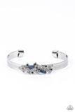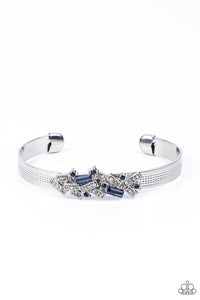 A jumble of dazzling blue and white rectangle-shaped rhinestones mingle with small blue sparkling rhinestones atop a modern stamped silver cuff.