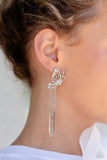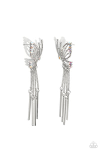 Featuring dainty white rhinestones and dainty marquise-cut iridescent gems, a thin, elongated, airy silver butterfly is titled to the side as if about to take off in flight. A collection of dainty silver rods swings from dainty silver chain tassels at the bottom of the whimsical frame for some free-falling movement. Earring attaches to a standard post fitting. Due to its prismatic palette, color may vary.