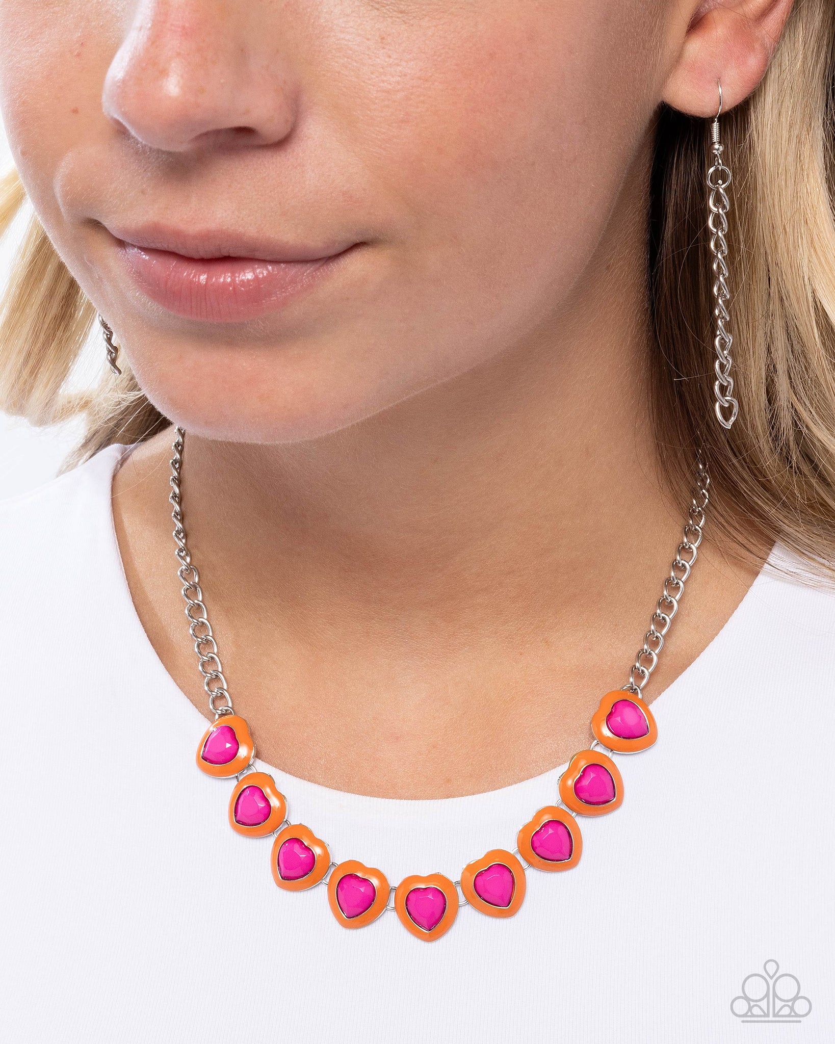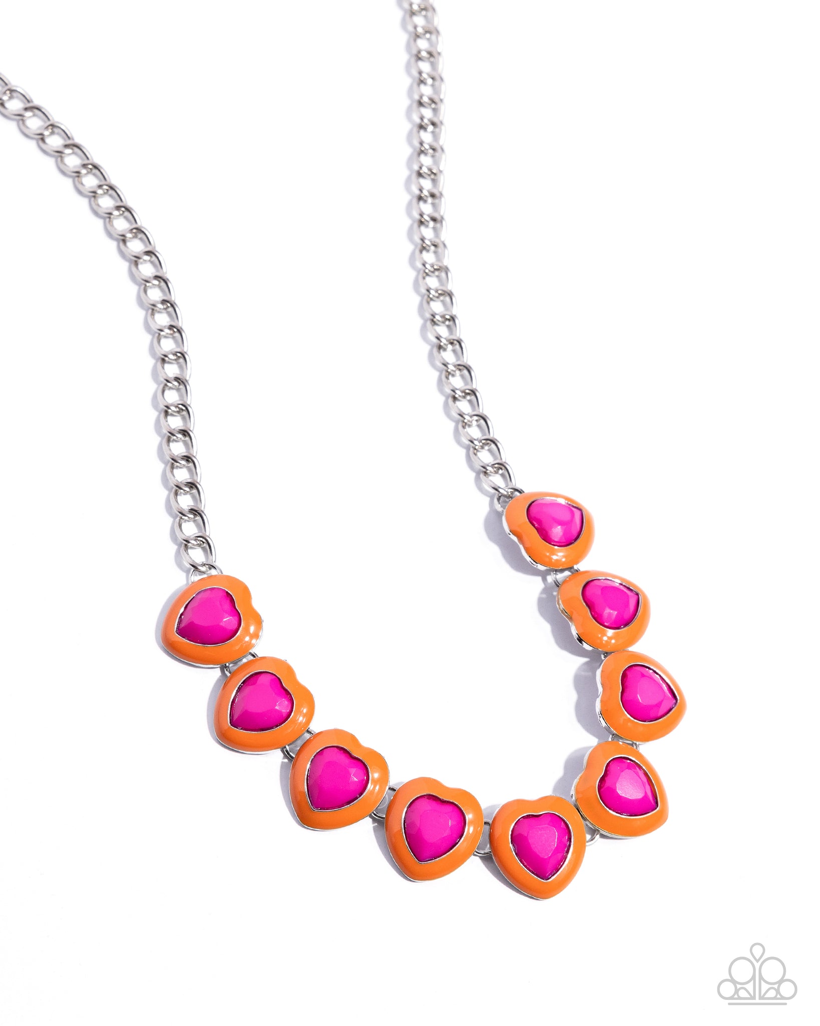 Framed in orange-painted frames, a row of faceted hot pink heart beads dramatically links into a powerful pop of color below the collar along a silver curb chain. Features an adjustable clasp closure.