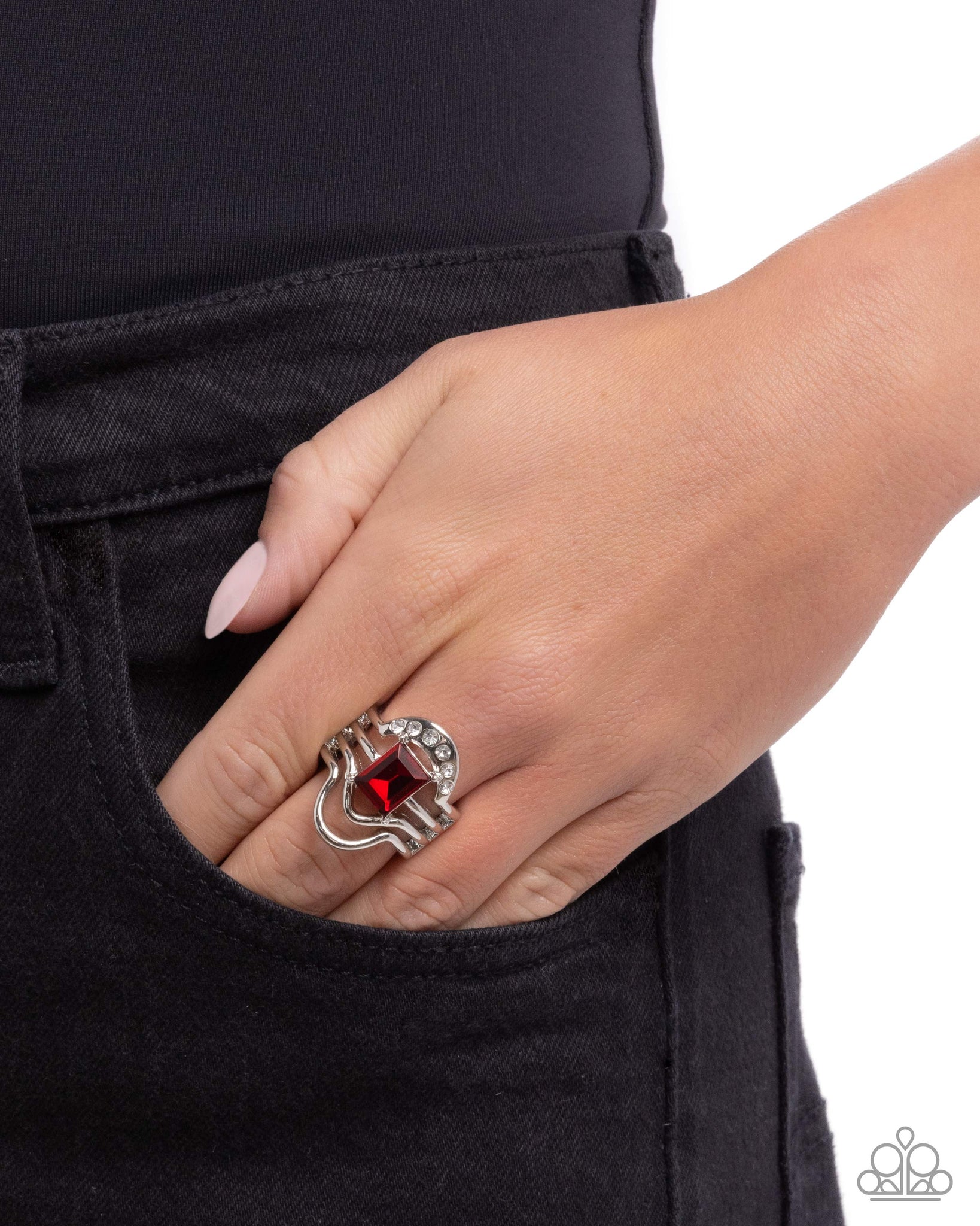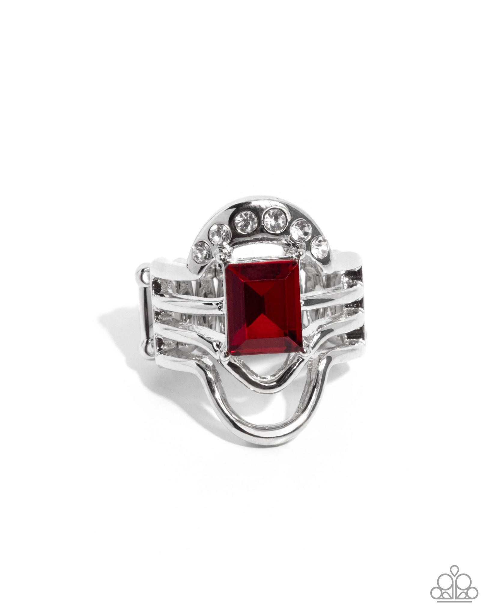 Featuring silver bars that curve up and below the finger, a collection of dainty white rhinestones crowns a silver-pronged faceted red square gem for a standout shimmery display. Features a stretchy band for a flexible fit.