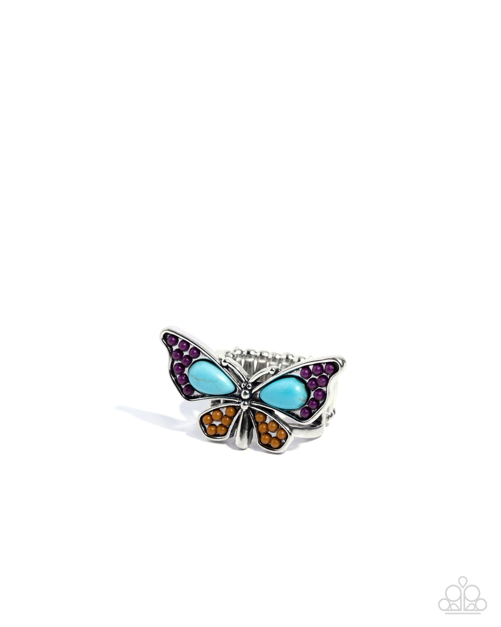 Dotted with Plum and Buckthorn Brown seed beads, a turquoise stone teardrop-embellished dainty silver butterfly flutters atop the finger for a whimsical pop of color. Features a stretchy band for a flexible fit. As the stone elements in this piece are natural, some color variation is normal.