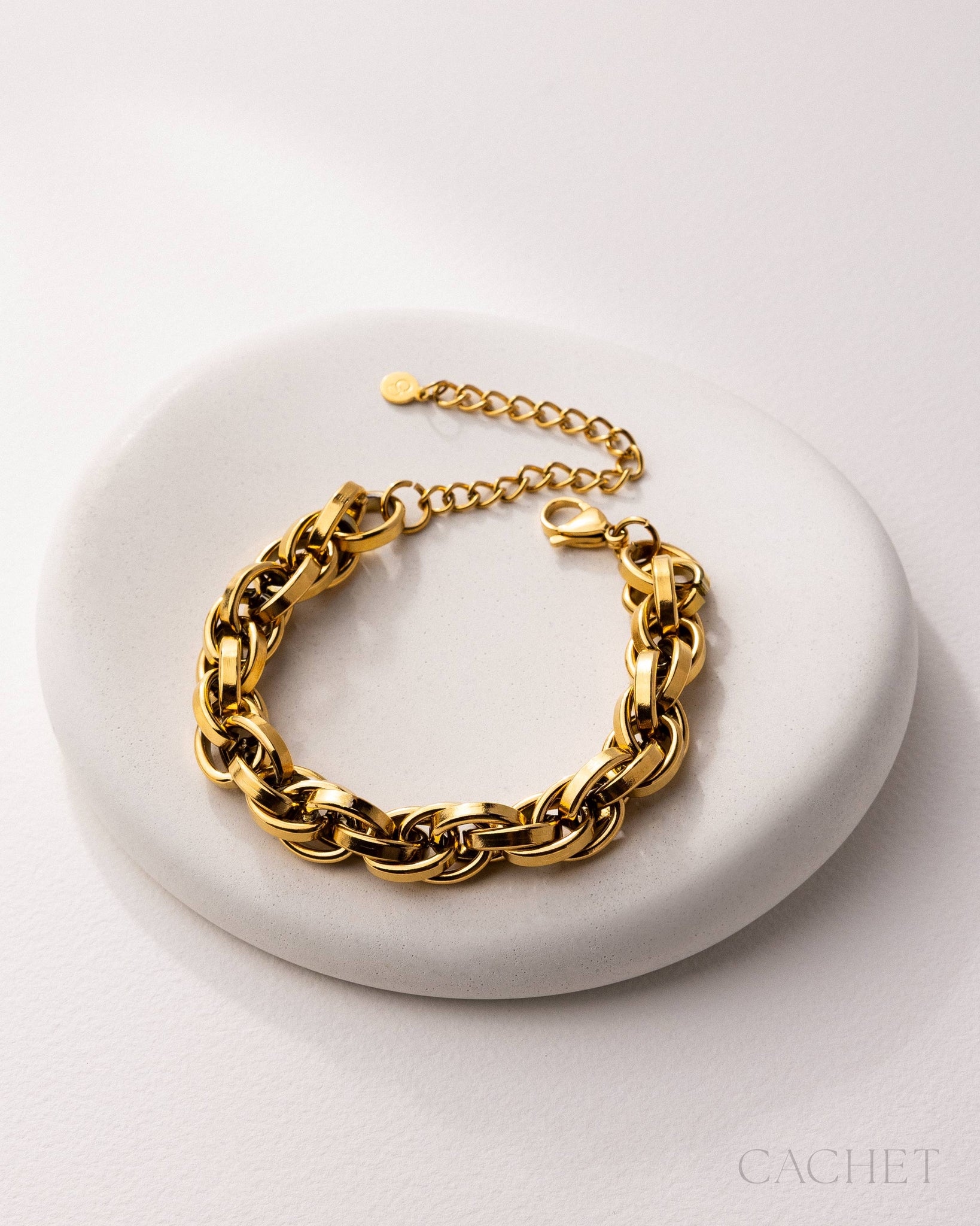 Like a bond forged in brilliance, the bracelet "Attaché" wraps the wrist in thick layers that intertwine with deliberate strength and enduring sophistication.