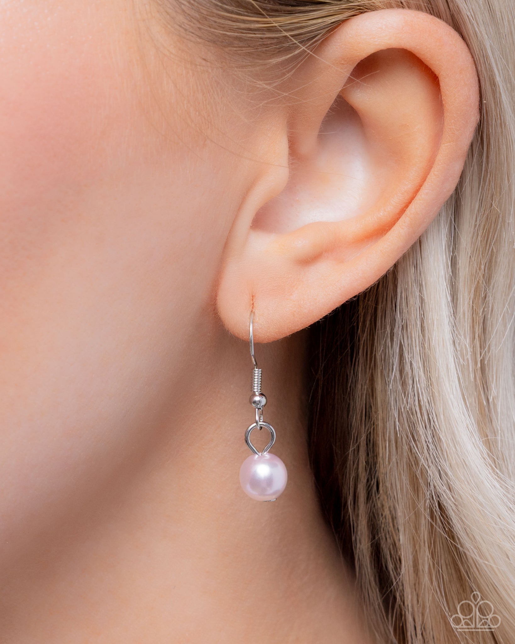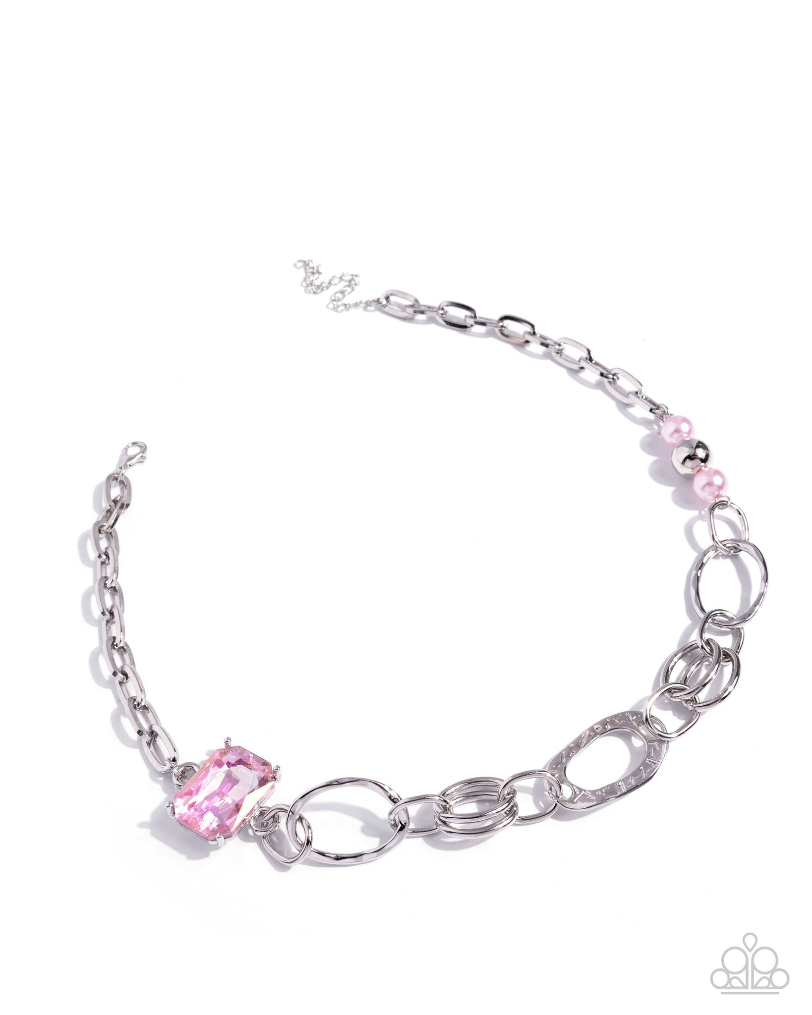 Interrupting a silver paperclip chain, a collection of hammered and sleek silver rings in varying sizes, a silver bead, baby pink pearls, and a UV-shimmery pink emerald-cut gem coalesce and pattern below the neckline for an elegantly eclectic display. Features an adjustable clasp closure.