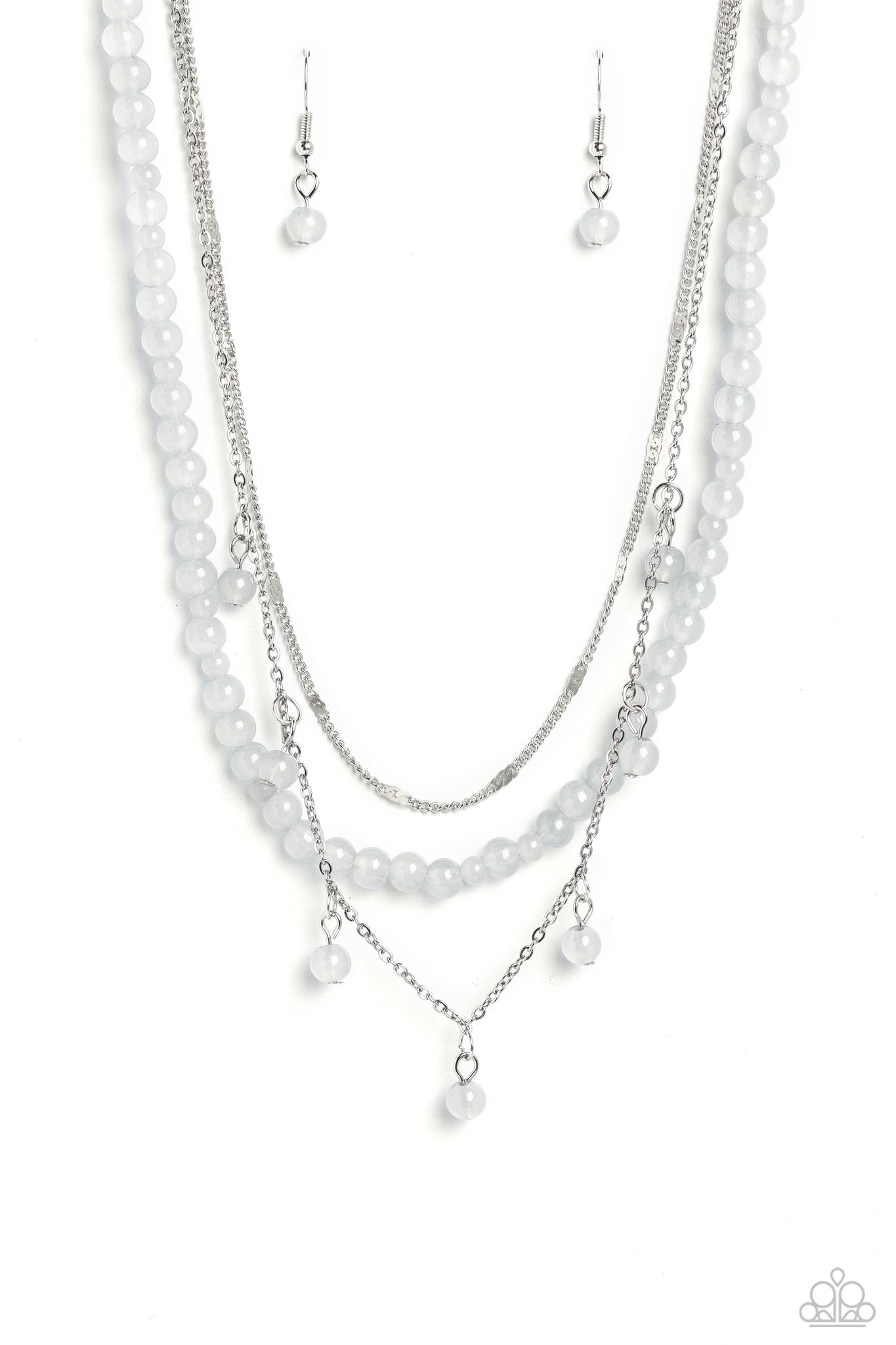 A strand of gray stone beads is paired with two strands of classic silver chain, creating effortless layers along the neckline. One of the silver chains is dotted with sections of flattened silver bars, while the other is adorned with a sampling of gray stone beading that infuses the design with playful movement. Features an adjustable clasp closure.