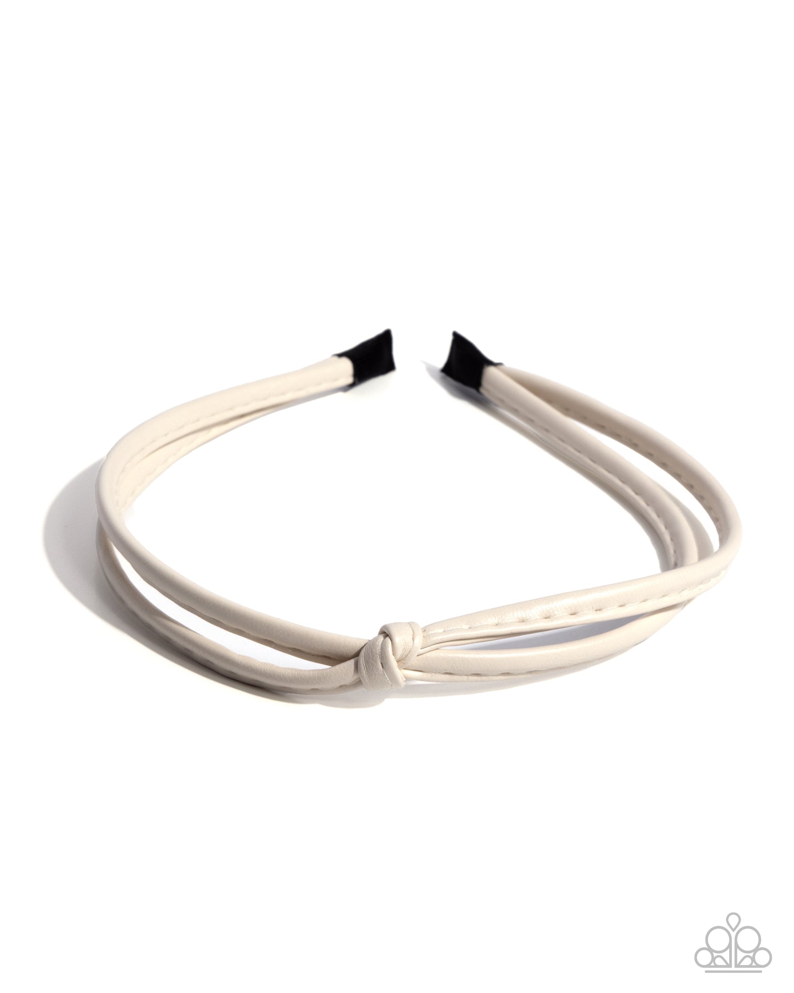 Featuring a knotted centerpiece, polished, white faux leather bands curve atop the head evoking a uniquely preppy style.