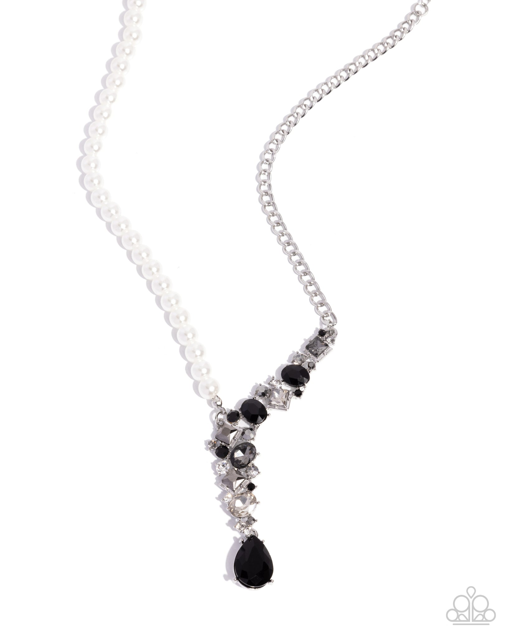 Infused along an invisible string, an elegant array of polished white pearls meets a silver curb chain halfway along the neckline for a mismatched look. Pronged in silver fittings, multicolored gems in varying cuts and opacities, clusters and gives way from the silver chain, intersecting the pearly strand for an adorably angled finish. An oversized black teardrop gem dangles at the bottom of the piece, adding a touch of refinement to the design. Features an adjustable clasp closure.