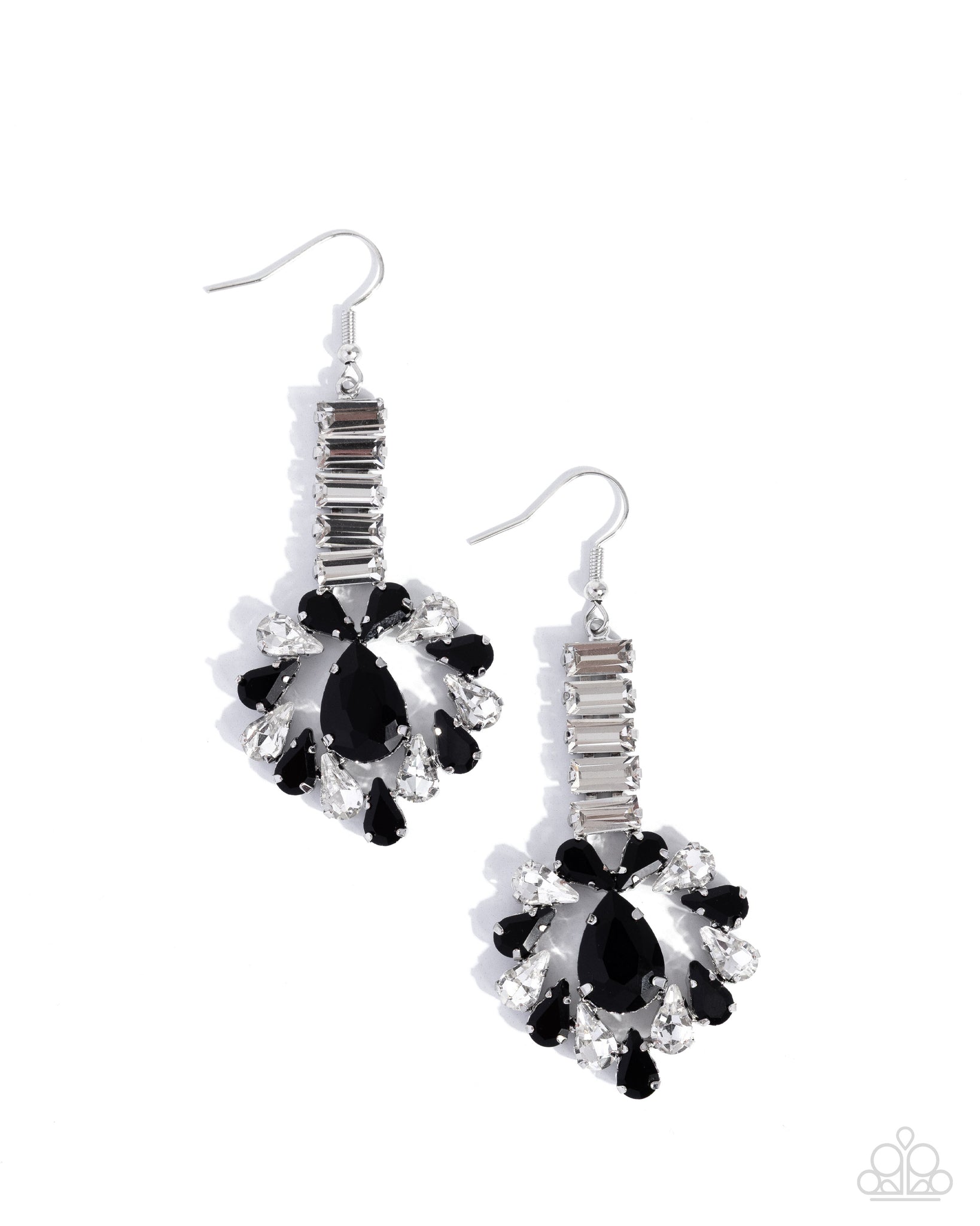 Pronged in silver fittings, a collection of white and black teardrop gems coalesces below the ear into a radiantly romantic heart from a quintet of emerald-cut white gems, showcasing an oversized black teardrop gem in the center of the heart for a shimmery finish. Earring attaches to a standard fishhook fitting.