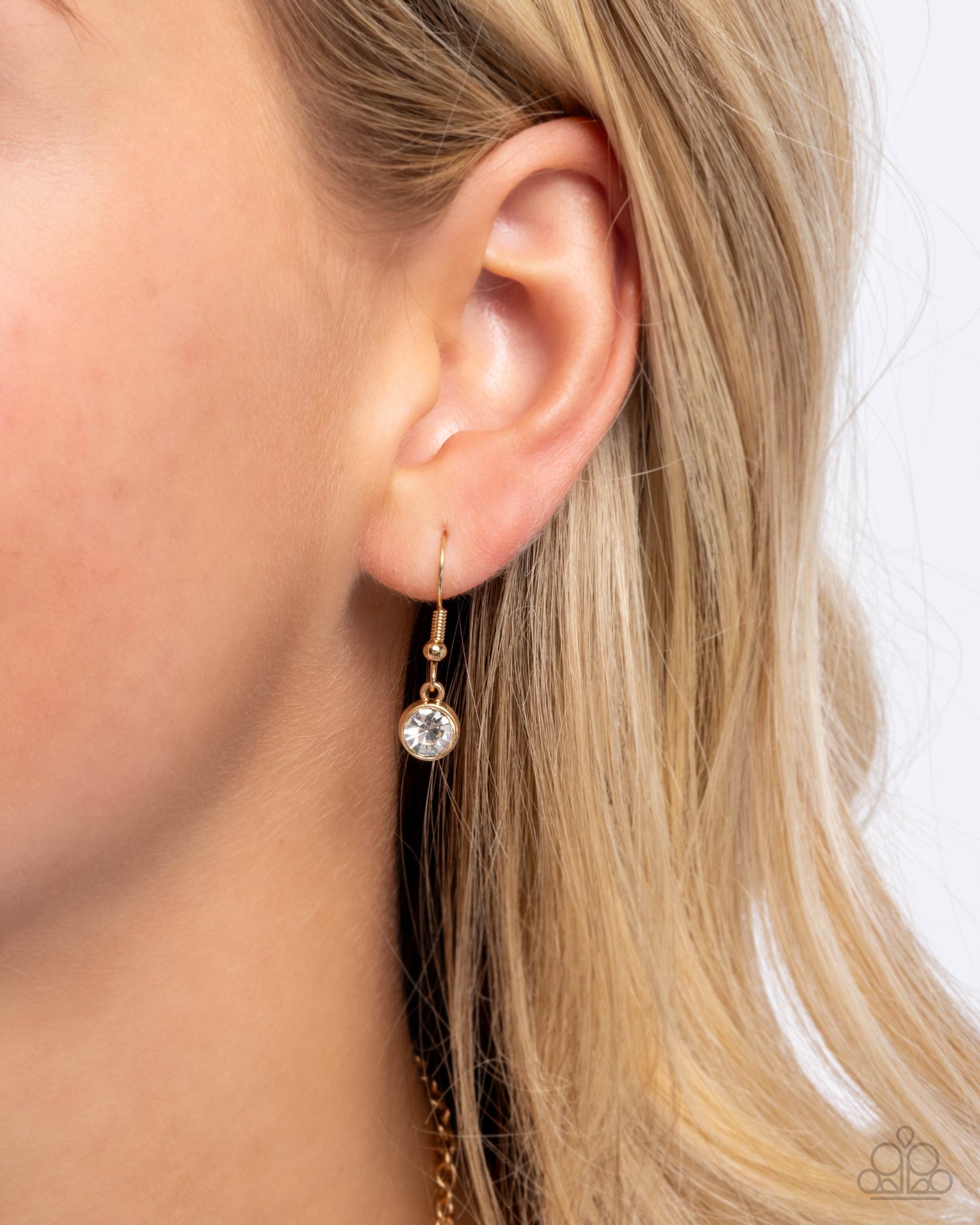 A collection of whimsical charms, including a shiny copper rhinestone-encrusted bone, smooth gold and shiny copper heart accents, and a circular gold pendant with a cutout paw print framed by white rhinestones, hang from a gold chain. A carabiner-style clasp hangs from the bottom of the design to allow a name badge or other item to be attached. Features an adjustable clasp closure.