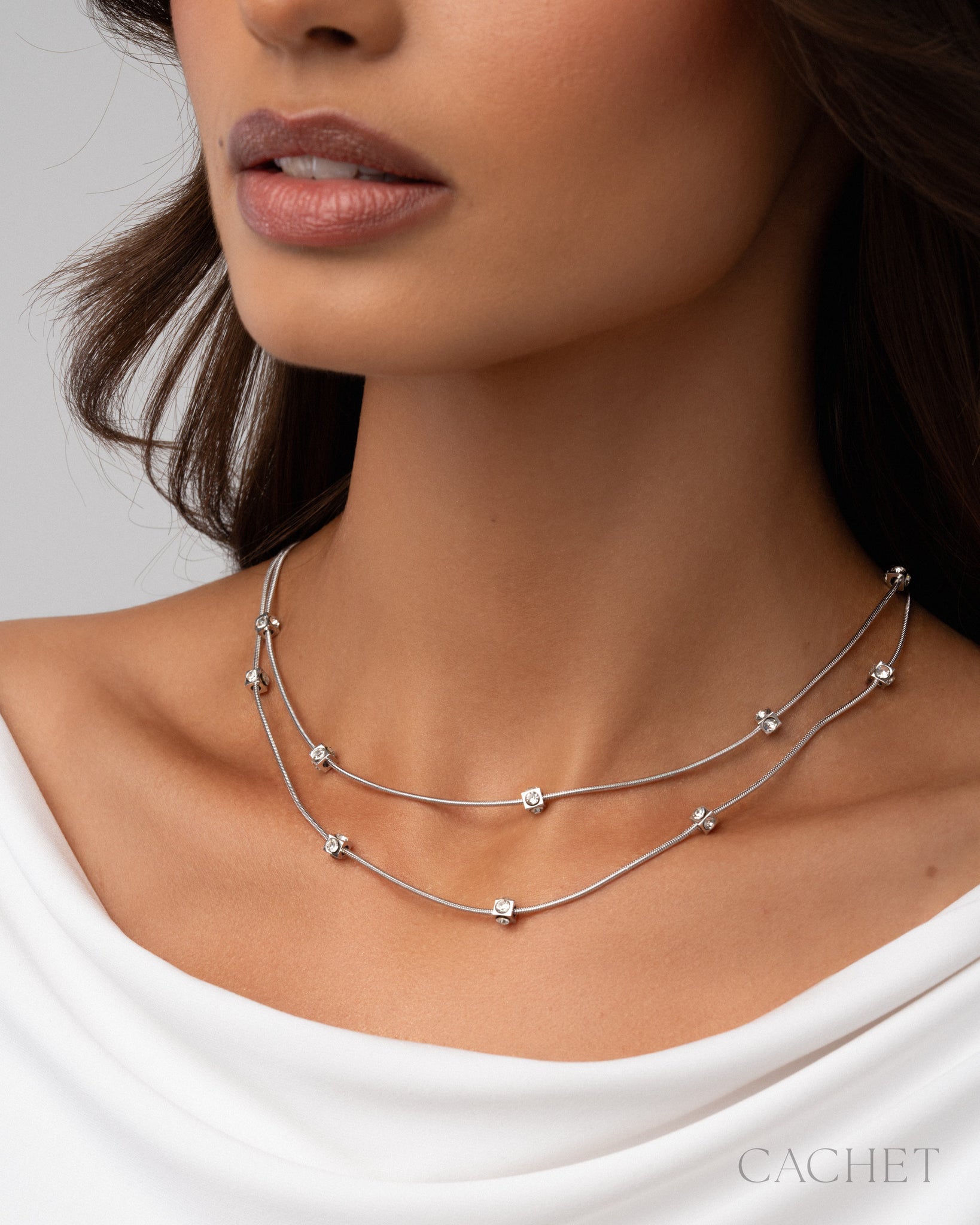 Crafted with intention, the necklace "Choisi" drapes the neckline in a tiered sweep of sleek snake strands punctuated by silver cubes featuring dainty elevated rhinestones, creating an effortless expression of curated elegance.