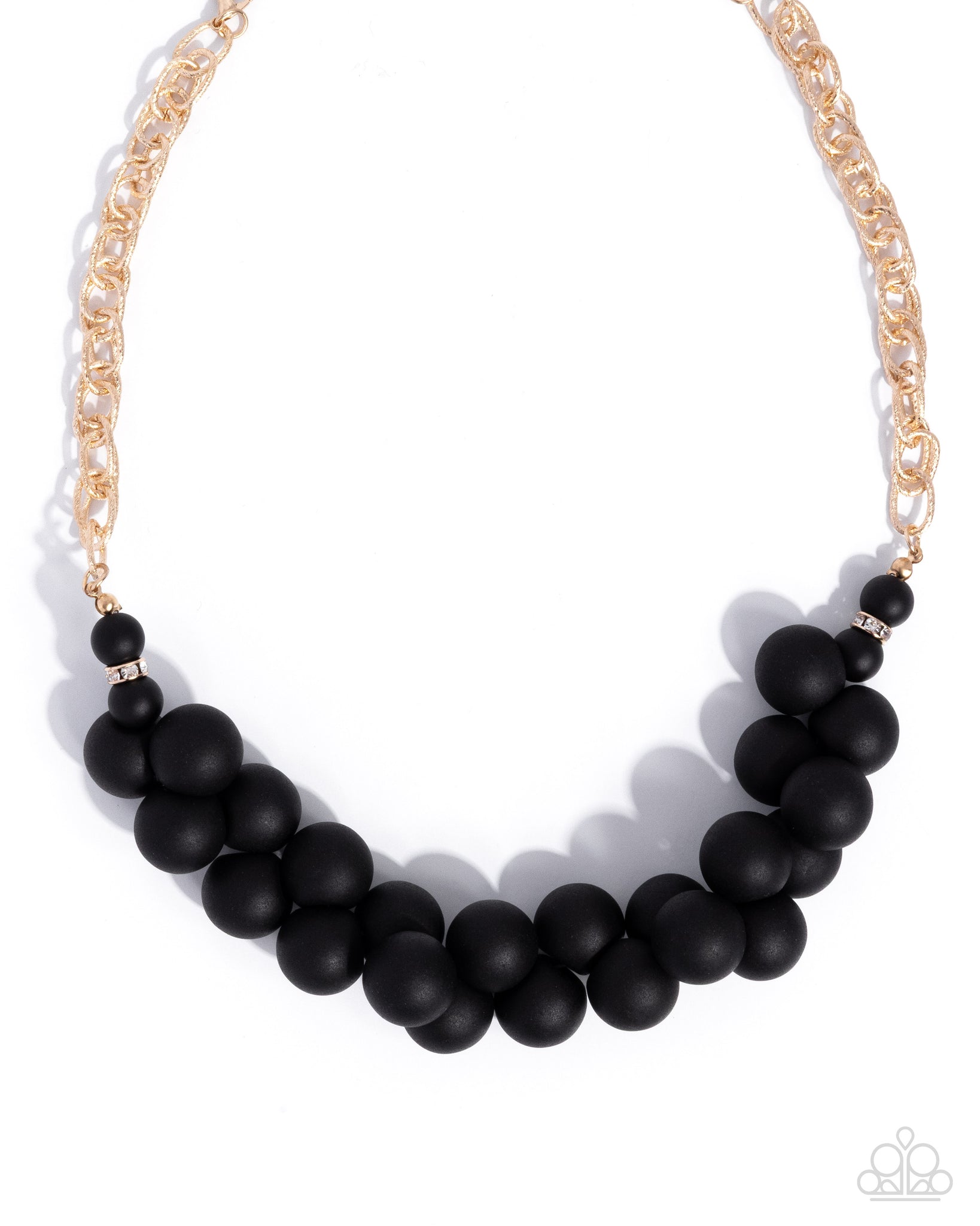 Matte black beads in varying sizes cluster and coalesce below the collar from textured gold links, creating a pop of fun-loving color. Solitaire gold rings dusted with white rhinestones encircle the uppermost black beads for a shimmery finish. Features an adjustable clasp closure.