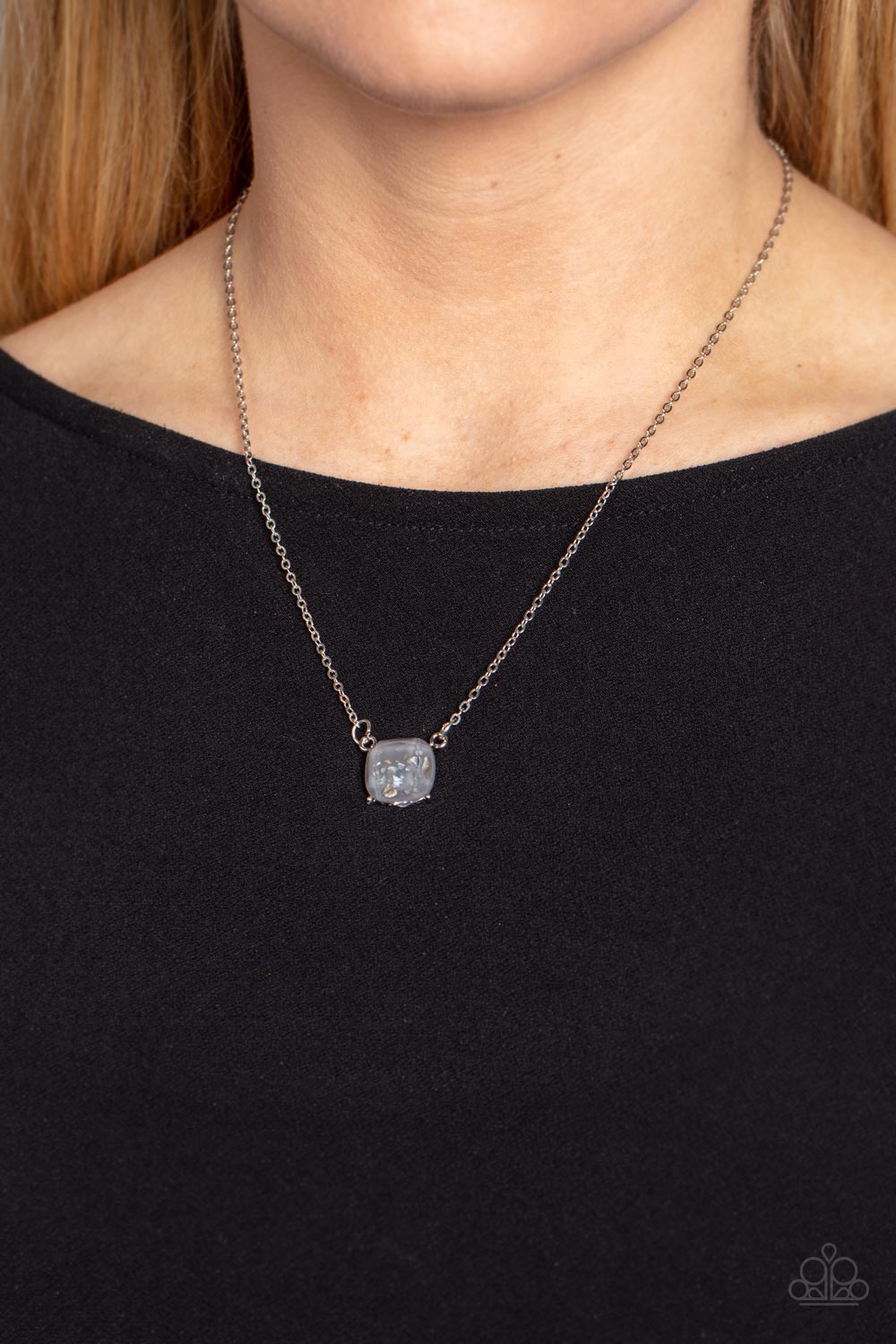 Flecks of iridescent shell are sprinkled inside a rounded square-cut, smoky gray rhinestone with a faceted surface. The pendant attaches to a dainty silver chain, creating a hint of shimmer below the collar. Features an adjustable clasp closure.