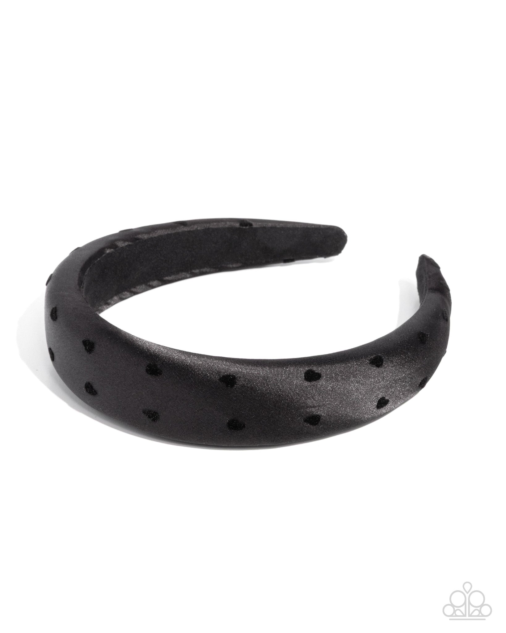 Featuring black heart polka dots, a black band with a black interior curves atop the head evoking a heartfelt haute style.