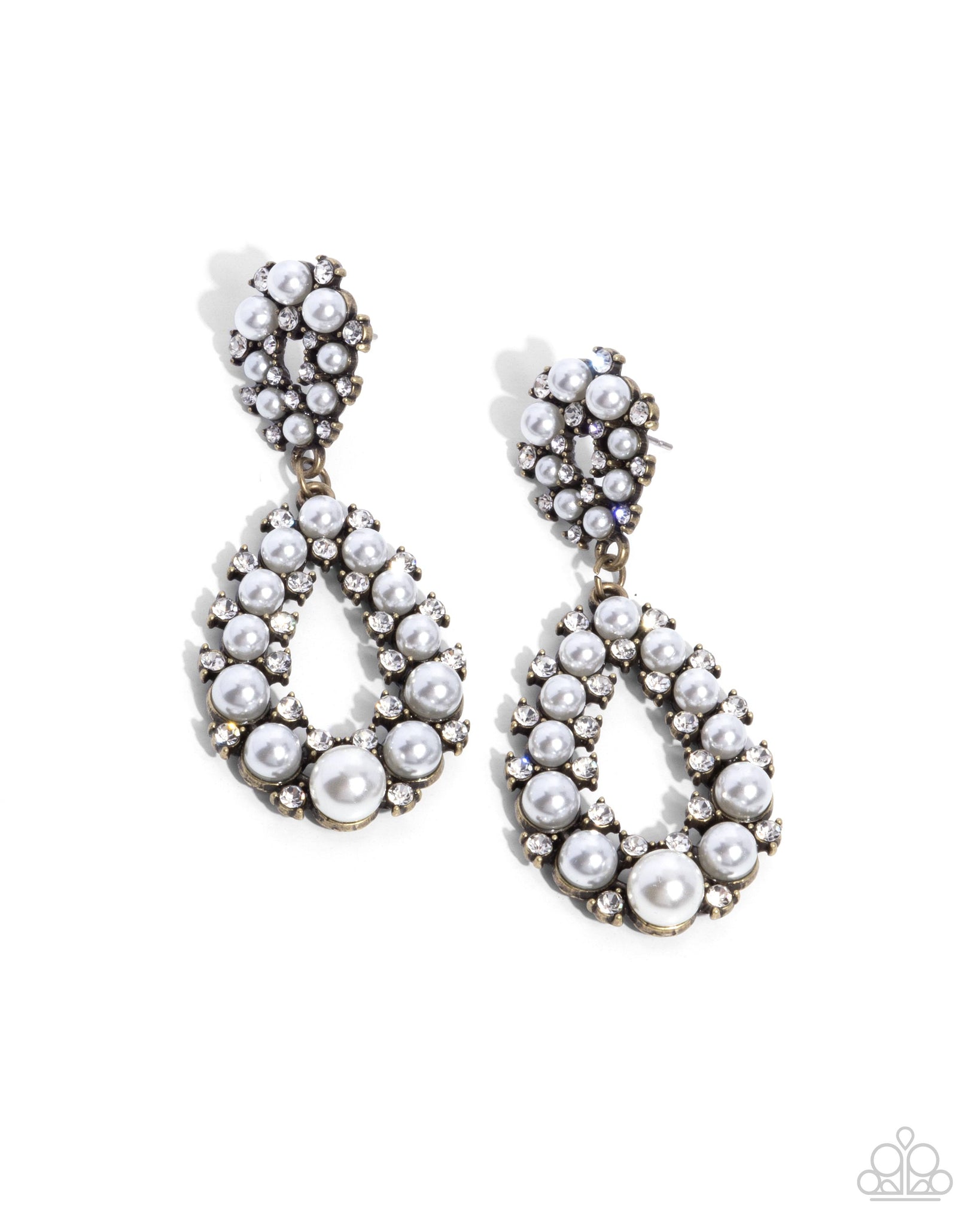 Varying in size and shape, a refined collection of brass-pronged white rhinestones flare out and are encrusted along a row of white pearls that gradually increase in size along an upside-down brass teardrop frame, giving way to a larger right-side-up teardrop frame embellished in the same timeless details for an attention-grabbing look. Earring attaches to a standard post fitting.