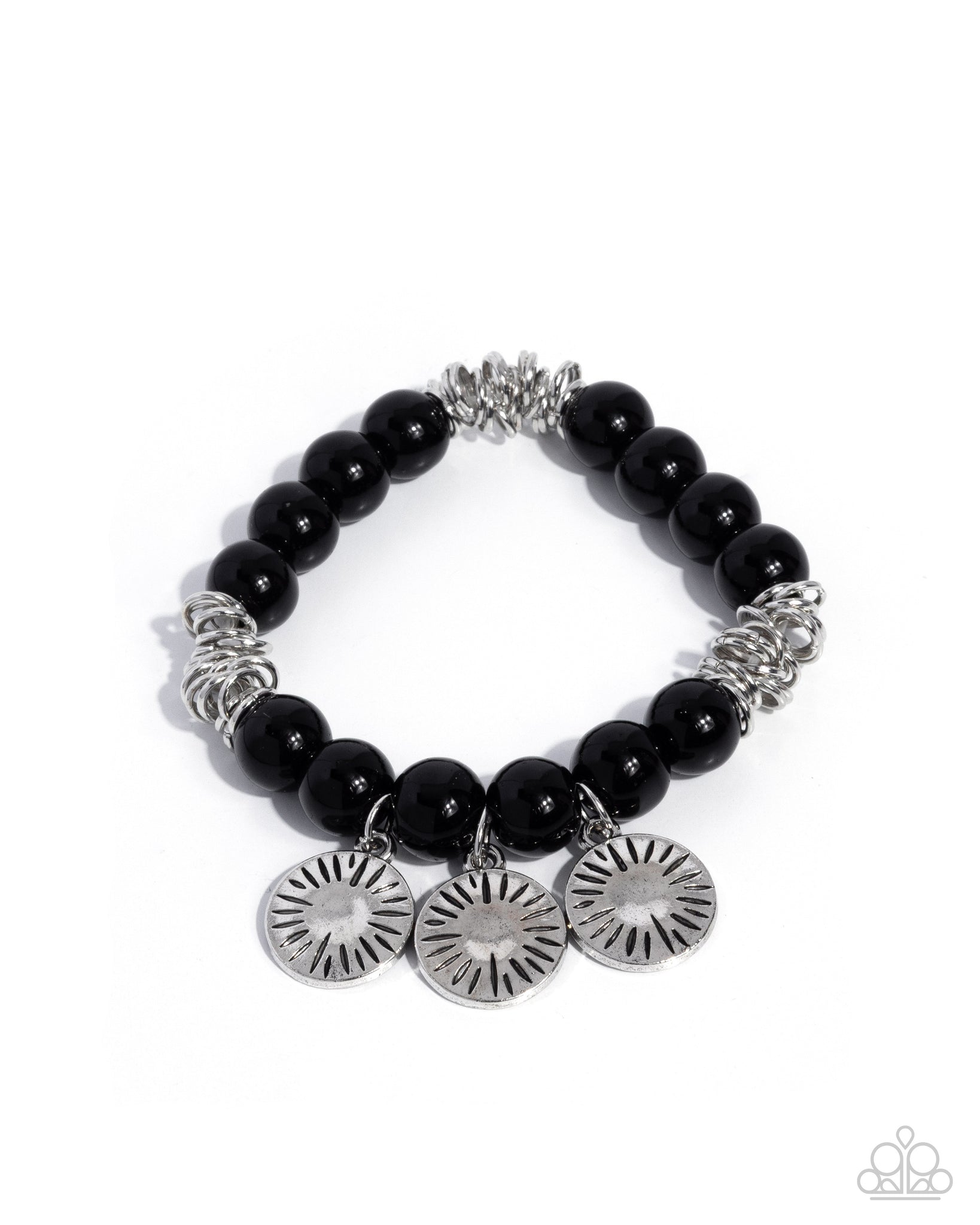Infused along an elastic stretchy band around the wrist, glassy black beads and copious silver rings pattern and glisten. A trio of silver sunburst-inspired discs sways from the center of the display for a socialite finish.