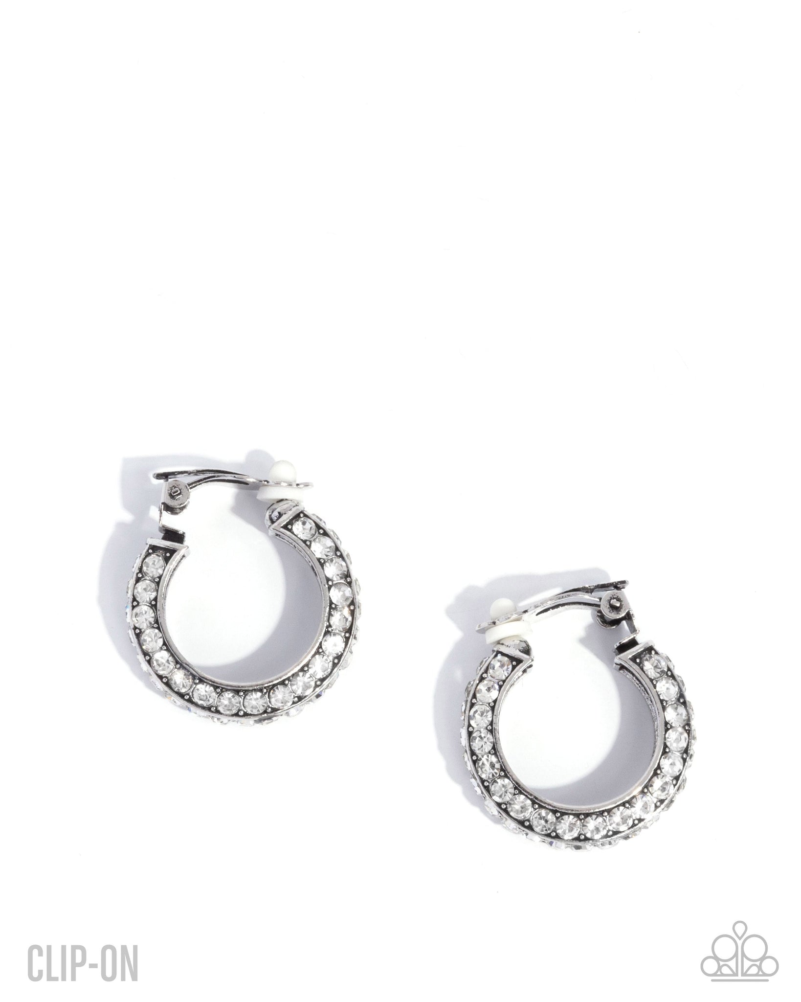 Dainty white rhinestones dance along the interior and exterior of a glistening silver hoop, creating a shimmery standout statement. Earring attaches to a standard clip-on fitting.