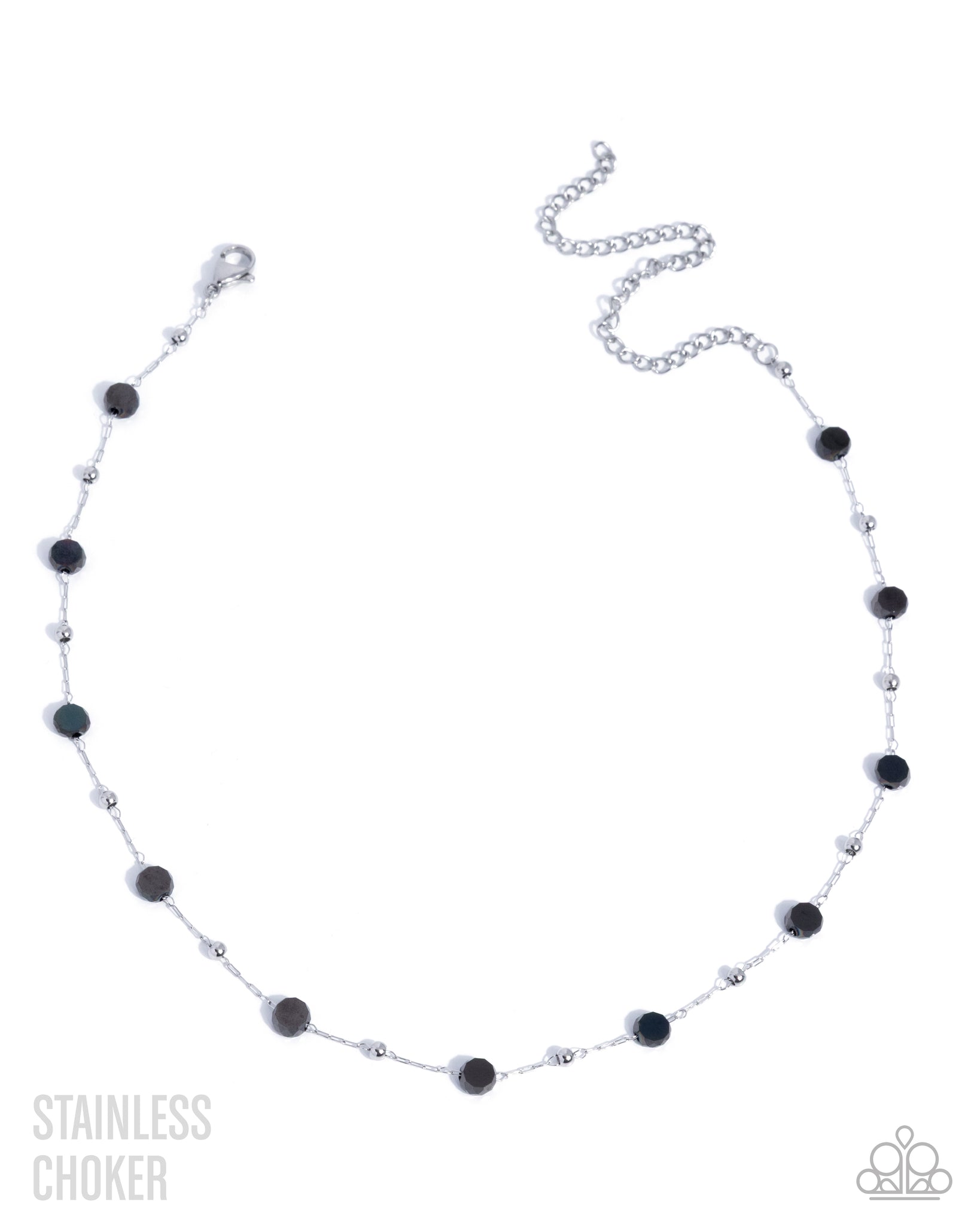 Featuring stainless steel, a glistening collection of faceted round black gems alternates alongside silver studs, cascading around the collar for a simply shimmery look. Features an adjustable clasp closure.
