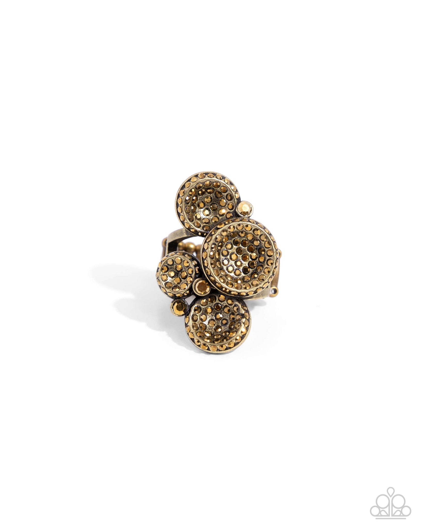 Featuring solitaire aurum rhinestones in brass fittings, dainty glassy aurum rhinestones explode and border across the center of glistening brass discs in varying sizes atop an airy brass band, creating a blinding shimmer. Features a stretchy band for a flexible fit.