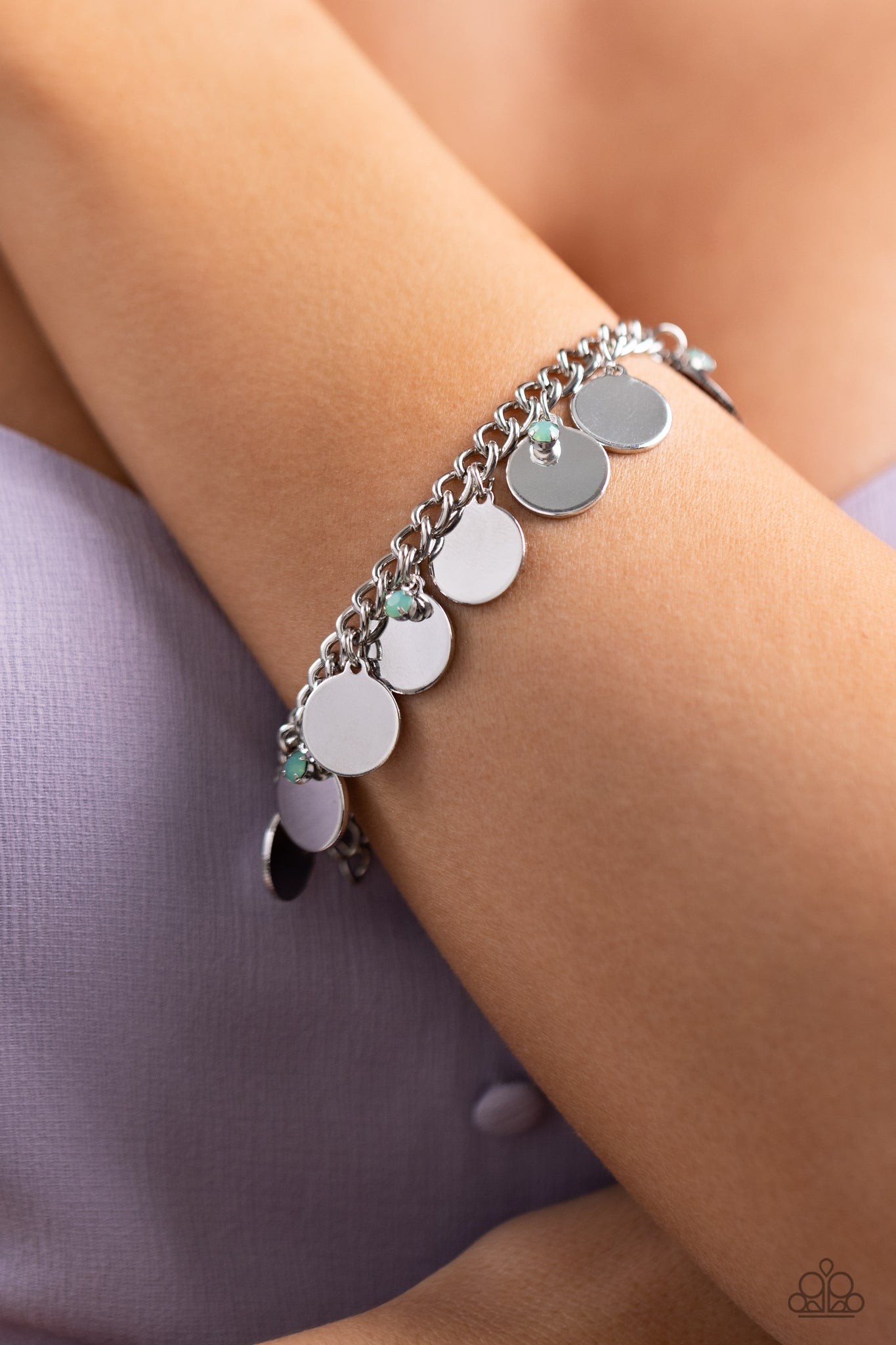 Dainty, opalescent green beads dance along a silver chain alongside high-sheen silver discs for an understated girly design. Features an adjustable clasp closure.