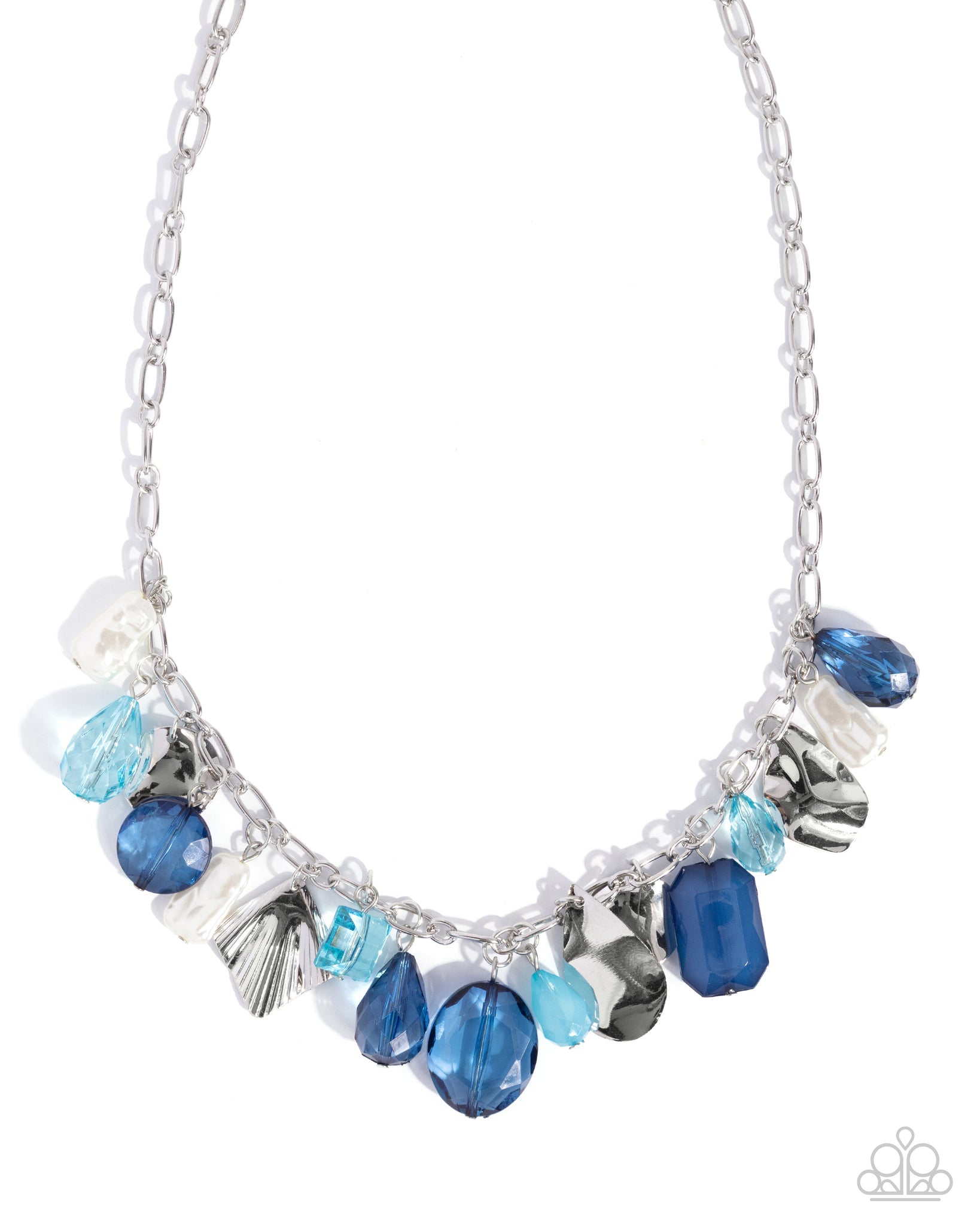 Featuring a variety of opacities, finishes, and shapes, a collection of hammered and textured silver accents, blue and Lyons Blue multicolored beads, and baroque white pearls sway below the neckline from a silver cable chain for an elegantly eclectic display. Features an adjustable clasp closure.