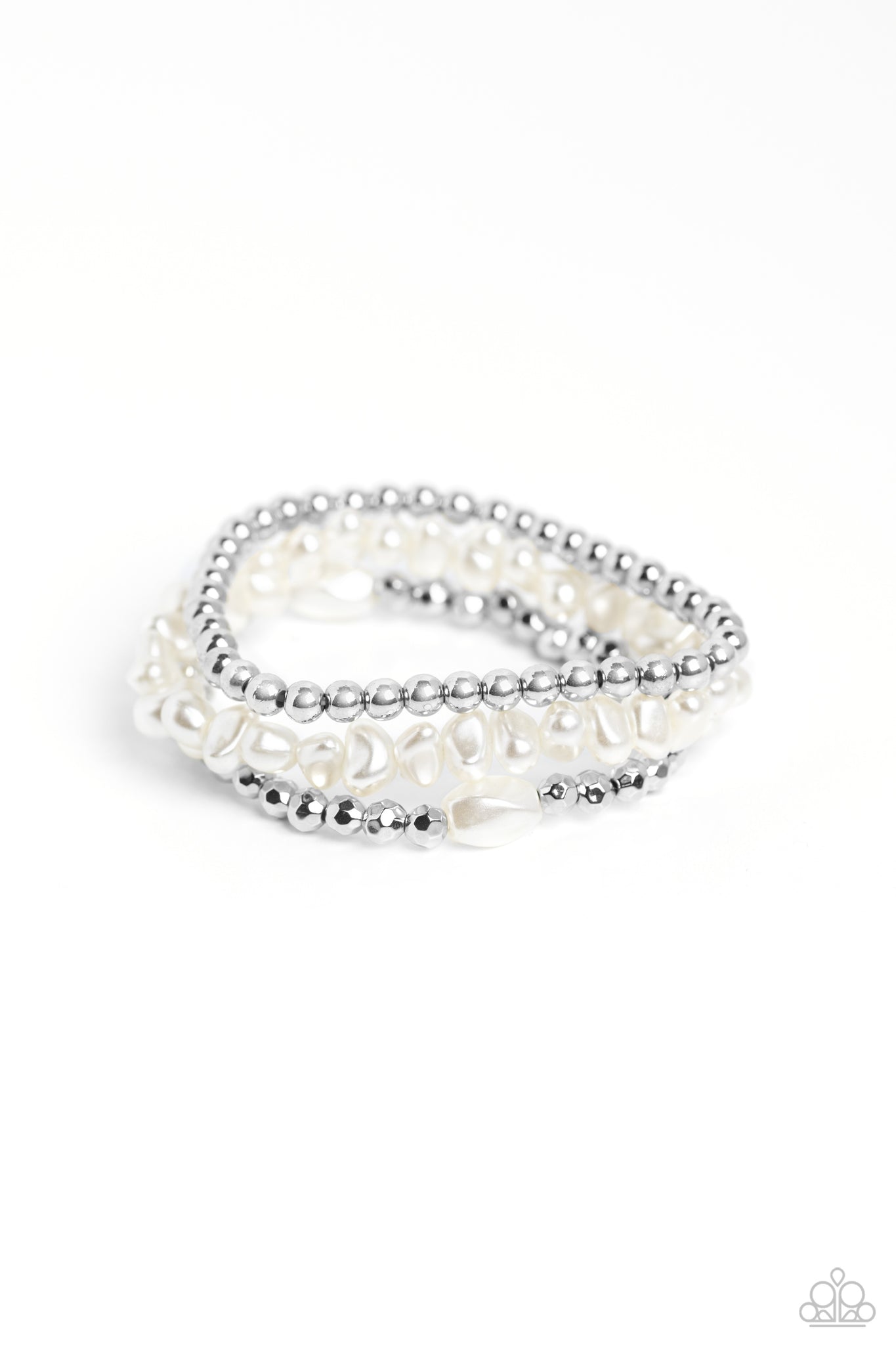 Coalescing into a light-reflecting stack up the wrist, silver beads, baroque white pearl beads, and faceted silver beads with a solitaire white pearl bead wrap around the wrist on elastic stretchy bands for a fashionable display.