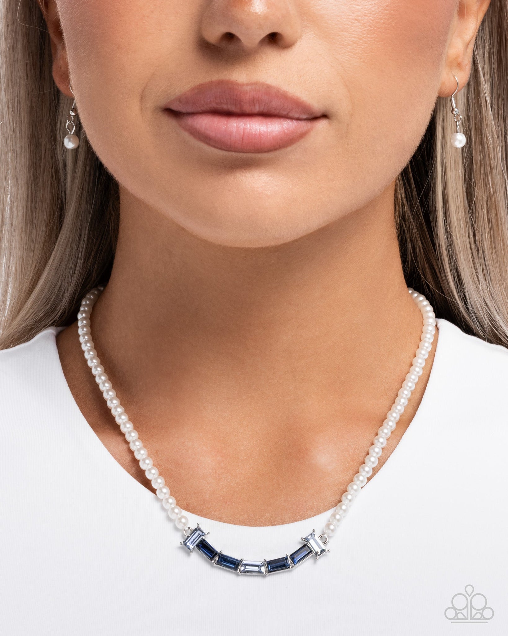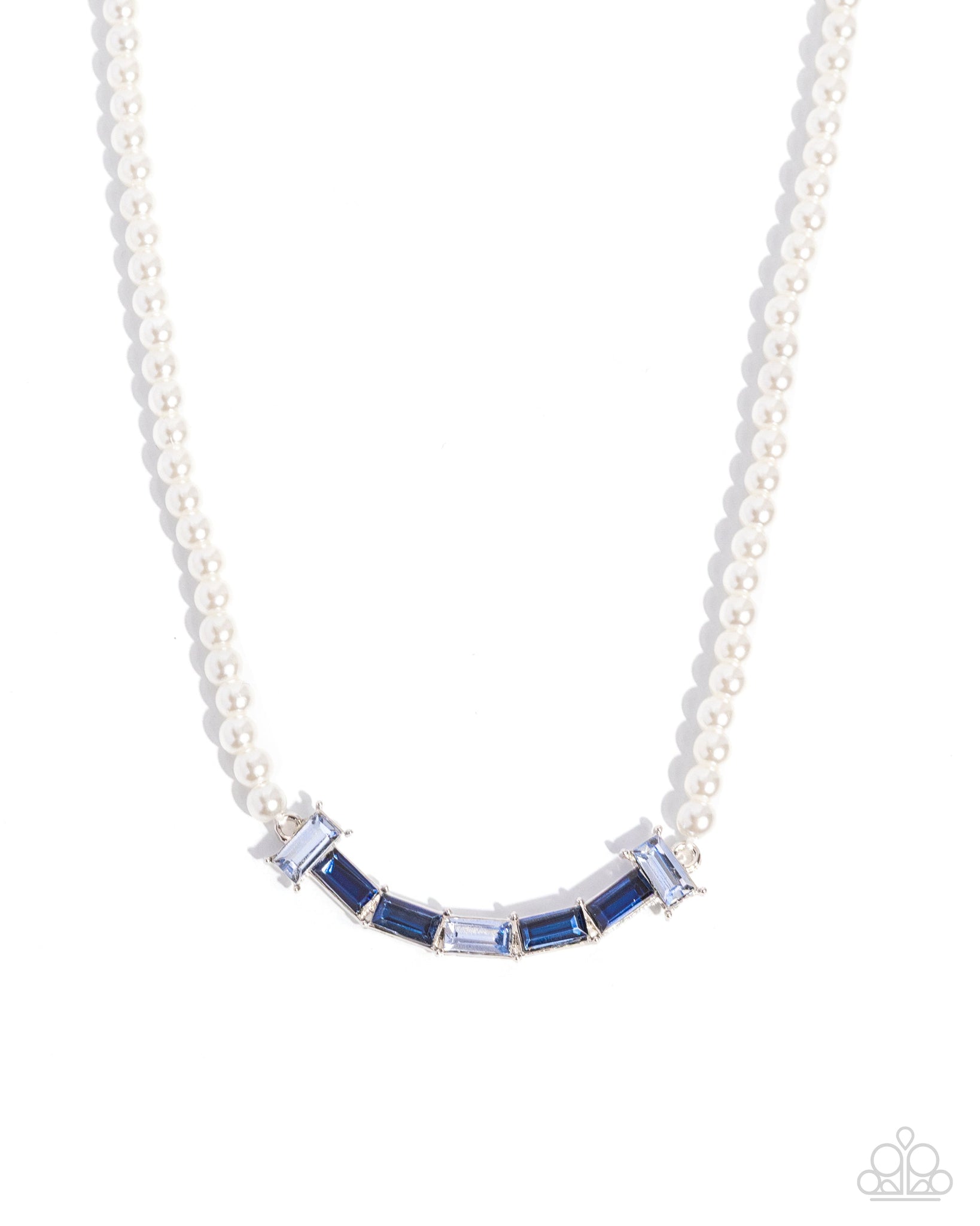 Encased in sleek silver-pronged fittings, faceted emerald-cut blue multicolored gems shimmer below the neckline from a polished collection of white pearls for a radiantly refined look below the neckline. Features an adjustable clasp closure.
