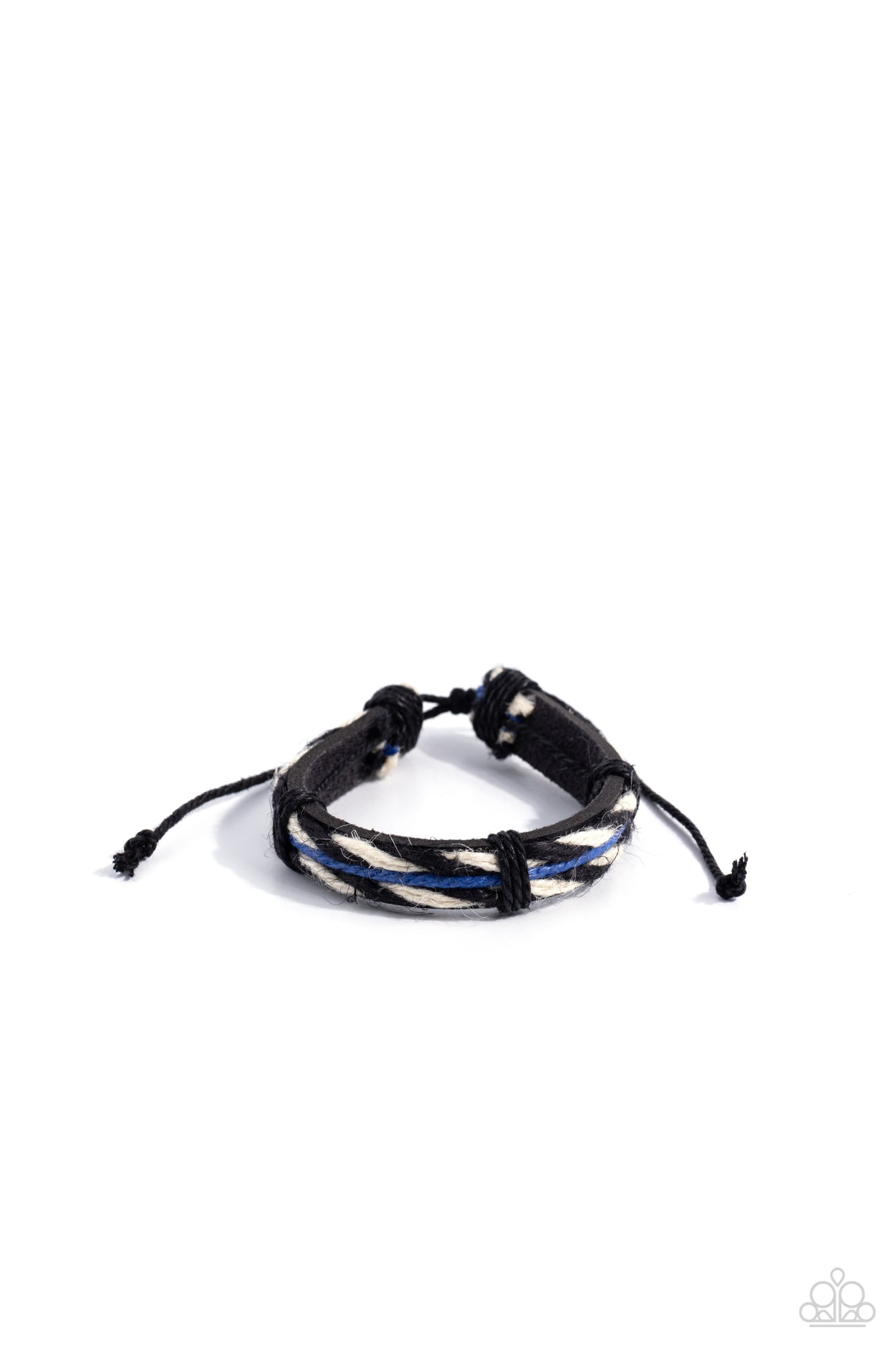 Infused with a single blue cord, twisting strands of white and black twine-like cording is knotted in place across the front of a black leather band, creating an urban centerpiece around the wrist. Features an adjustable sliding knot closure.