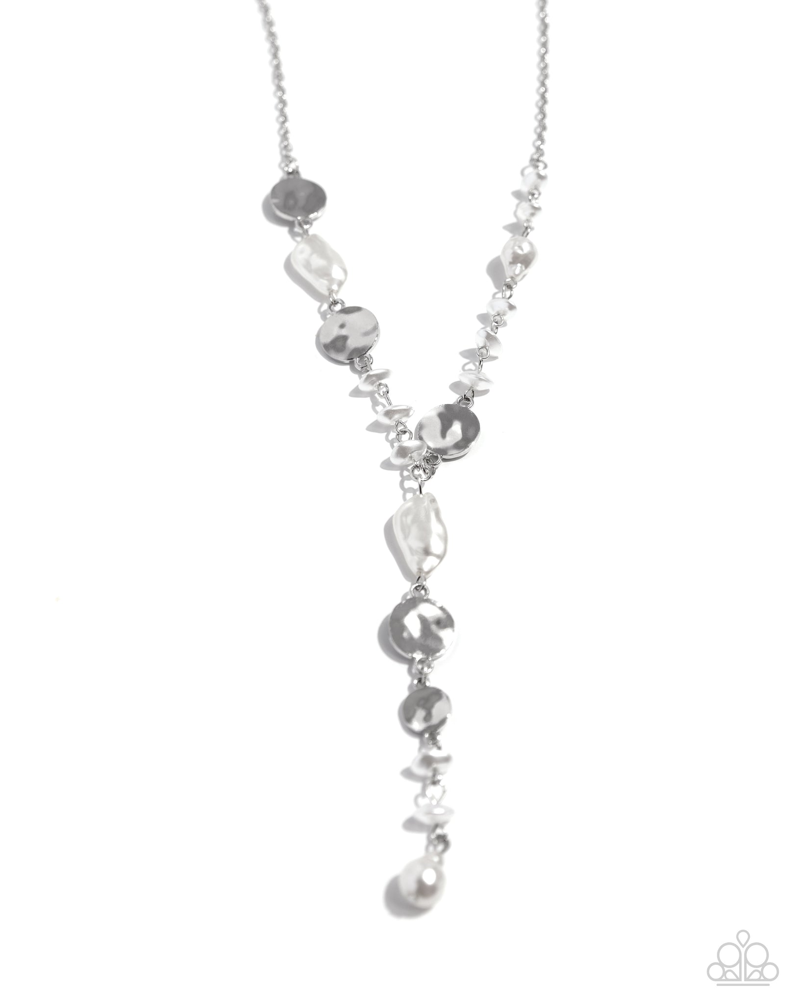 Infused along a classic chain, hammered silver discs, pearl beads, and baroque white pearls create an extended, refined pendant. Features an adjustable clasp closure.