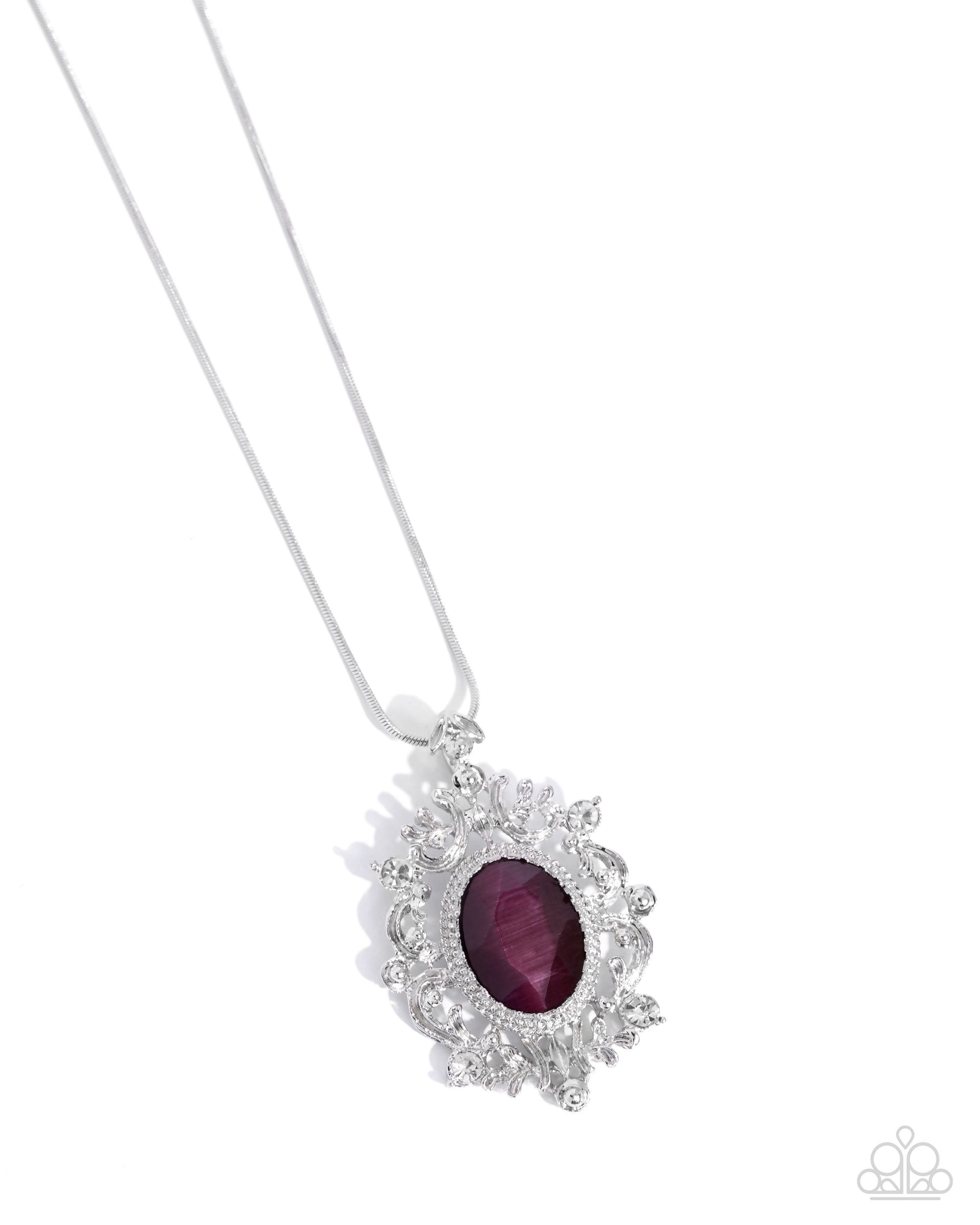 Dotted in glittery white rhinestones, leafy silver frames nestle around a faceted purple cat's eye oval center, creating a regal pendant at the bottom of a lengthened silver chain. Features an adjustable clasp closure.