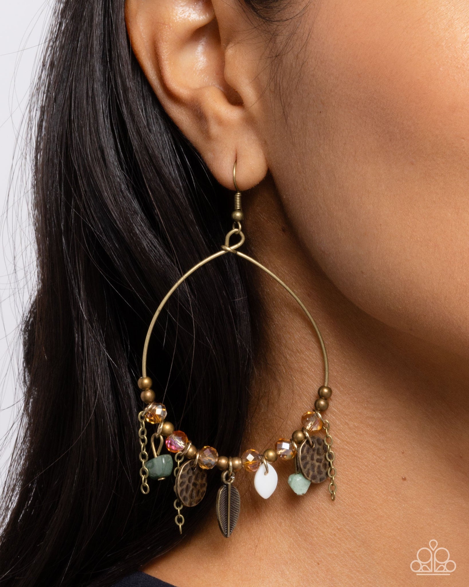 Infused along a brass teardrop wire hoop, a collection of eclectic materials including brass beads, brass hammered discs, dainty brass chain strands, light peach faceted beads, marquise-cut white shells, textured brass feathers, and jade stone pebbles whimsically gather along the ear for a free-spirited fringe. Earring attaches to a standard fishhook fitting. As the stone elements in this piece are natural, some color variation is normal.