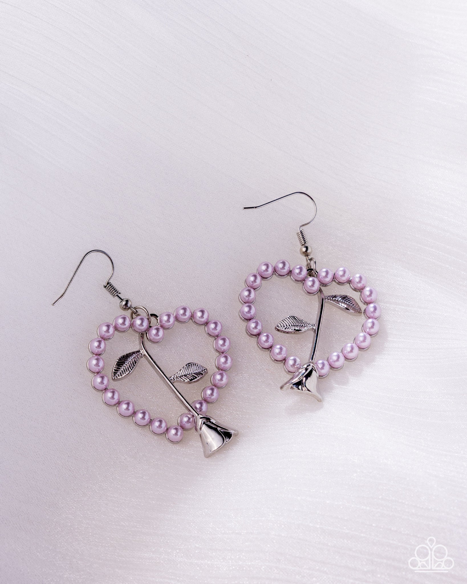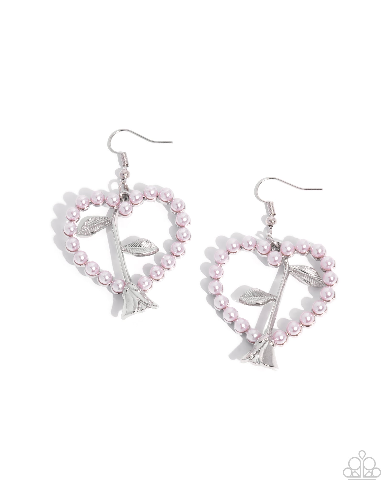 Featuring tactile textured silver leaves, an upside-down silver rose stem blooms through the center of a dainty baby pink pearl-embellished silver heart frame, reflecting below the ear for a delightfully darling look. Earring attaches to a standard fishhook fitting.