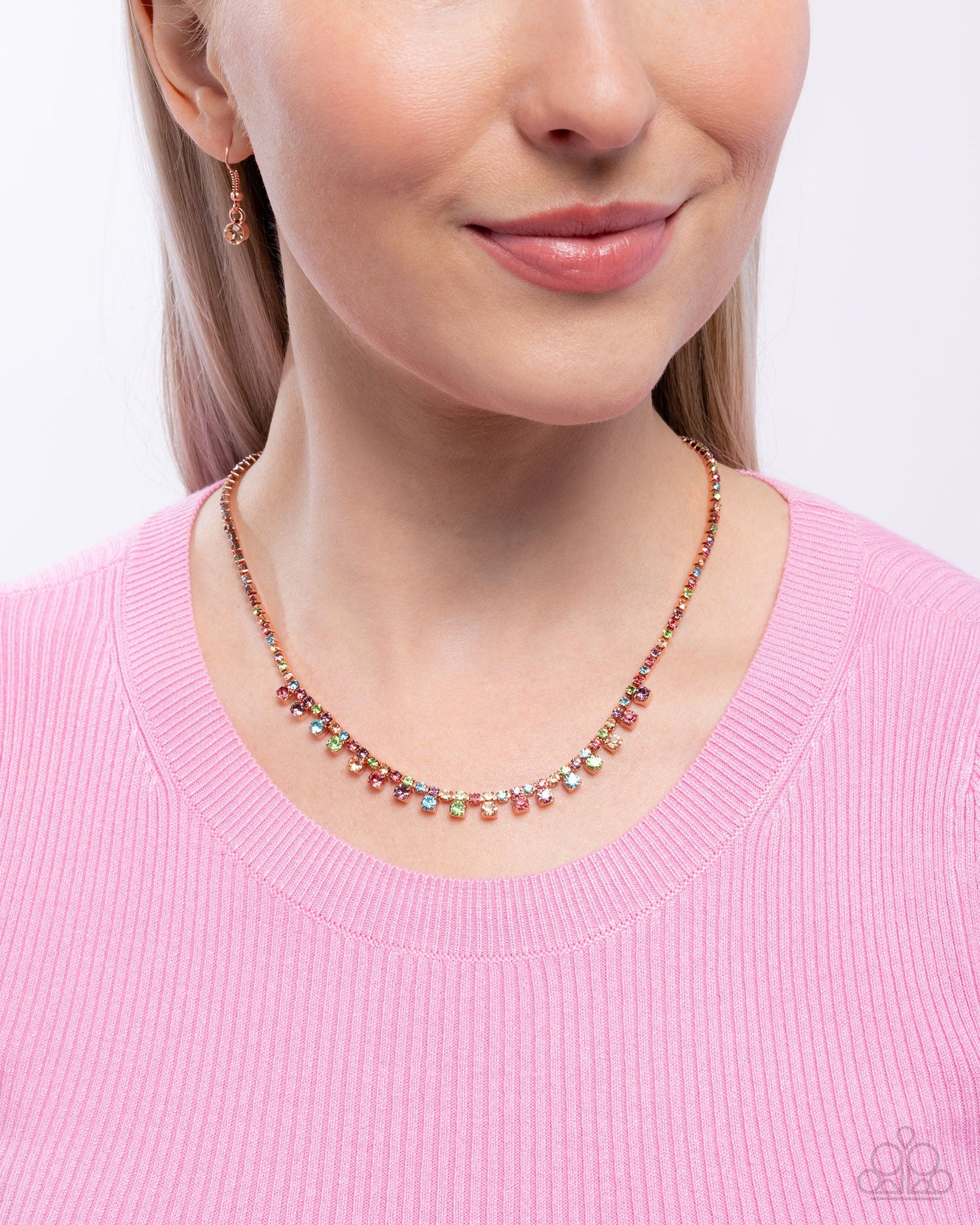 Set in shiny copper square fittings, a strand of multicolored rhinestones cascades below the neckline. Solitaire multicolored rhinestones in larger shiny copper fittings sit below the center of the rhinestone chain for additional glitzy color and eye-catching detail. Features an adjustable clasp closure.