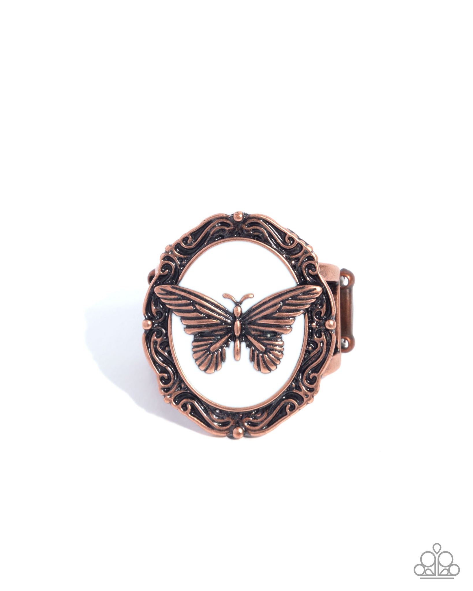 Featuring a copper filigree border, an intricately textured copper butterfly flutters atop an oval white painted backdrop for a whimsically elegant centerpiece. Features a stretchy band for a flexible fit.