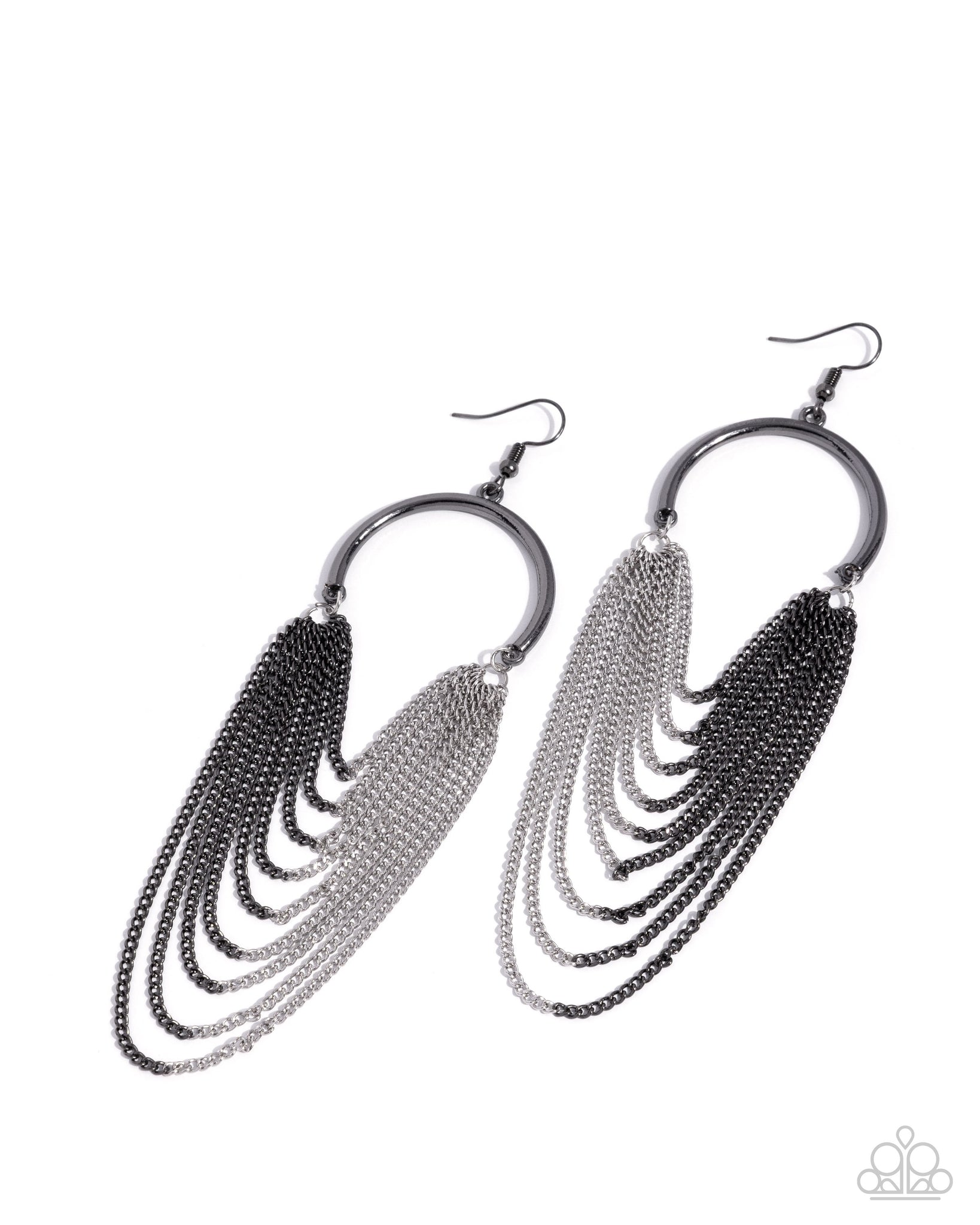Gathered rows of half-dipped gunmetal and silver chains cascade from the bottom of a shiny gunmetal arch, creating a glamorously glitzy fringe. Earring attaches to a standard fishhook fitting.