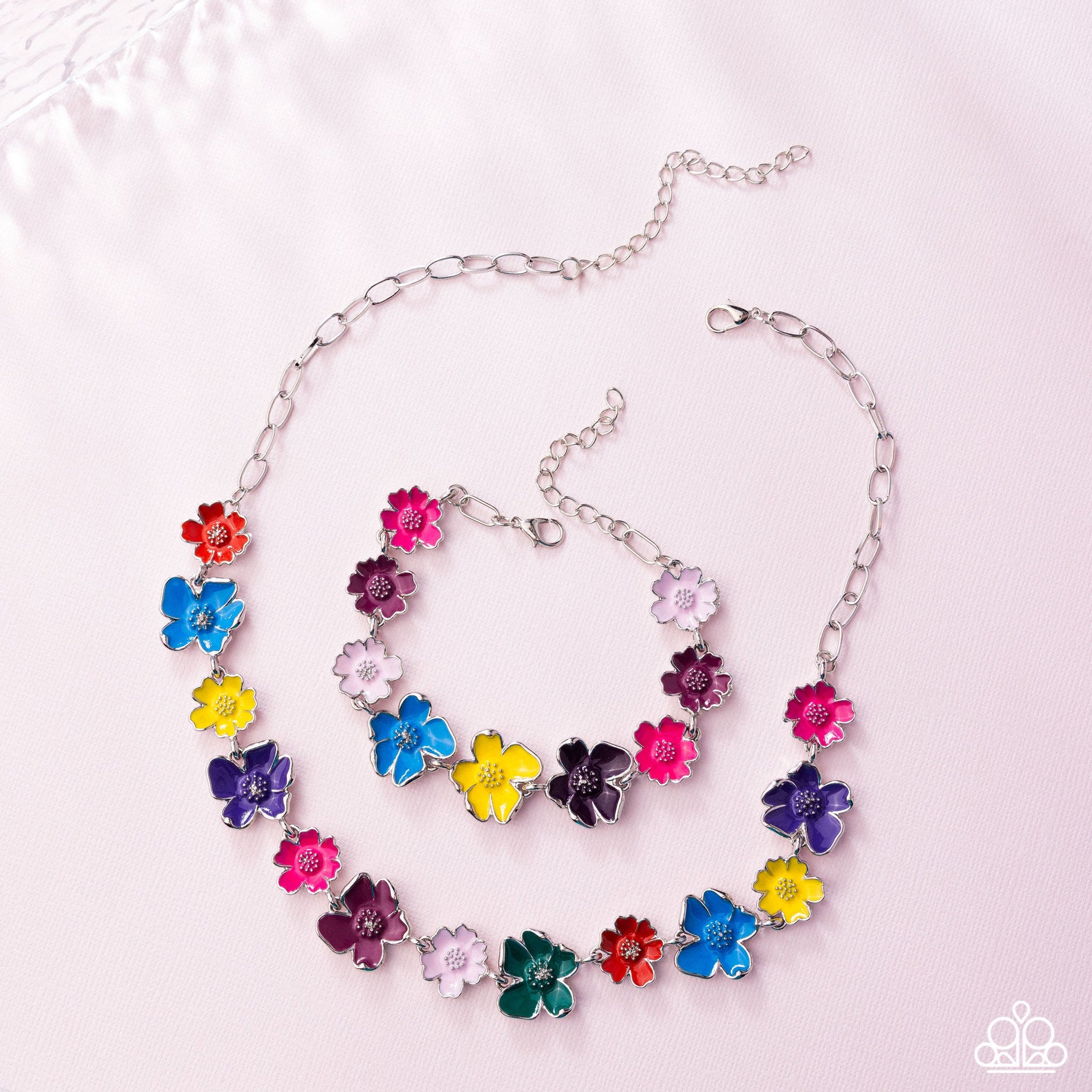 A row of colorfully painted flowers blooms to life along the collar from a silver paperclip chain, creating a vibrant statement piece. Each flower features a silver-studded centerpiece, flawlessly sprinkling the design with whimsical detail. Silver edging outlines some of the layered petals, emphasizing the handcrafted character of the design. Features an adjustable clasp closure.
