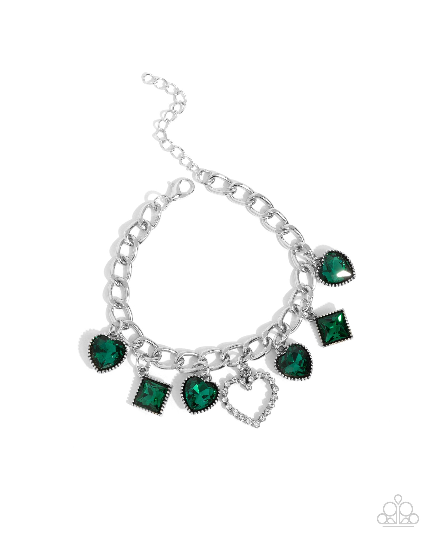 Pressed in silver-studded frames, a collection of emerald gem hearts and squares alternate and sway along a silver curb chain, leading the eye to a white rhinestone-dusted silver heart silhouette along the center of the wrist for a heartfelt, haute look.