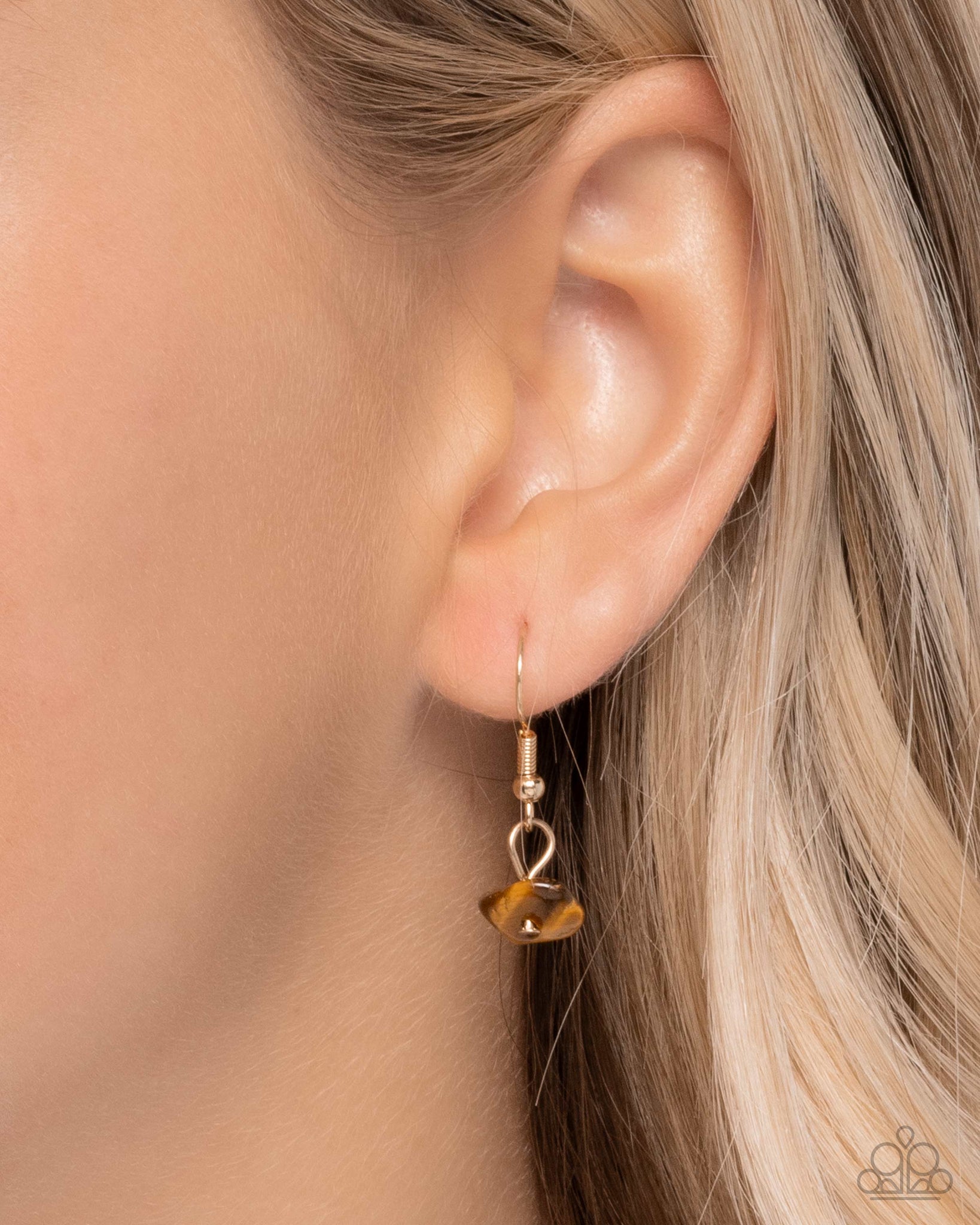 Infused along lengthy strands of brown cording, an antiqued gold bead knots around an antiqued gold disc. An antiqued gold elephant pendant, an amethyst stone-centered gold flower that gives way to a gold feather, and a chiseled tiger's eye stone coalesce below the chest from the gold ring for a serene statement. A lobster clasp hangs from the bottom of the design to allow a name badge or other item to be attached. Features an adjustable clasp closure. As the stone elements in this piece are natural, some color variation is normal.