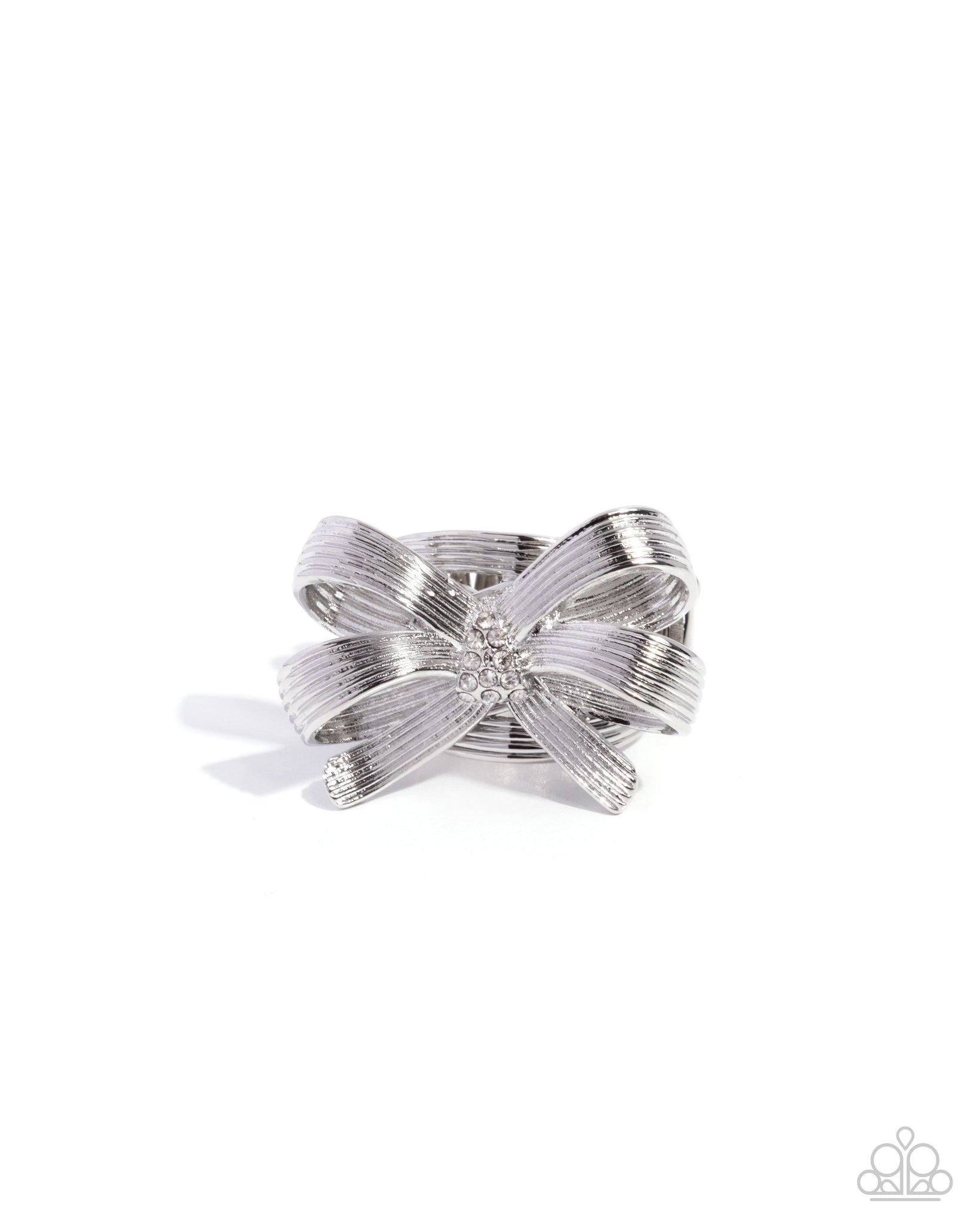 Gathered around a clustered collection of dainty white rhinestones, stripe-textured silver ribbons curl in every direction atop the finger for a coquette-inspired chic centerpiece. Features a stretchy band for a flexible fit.