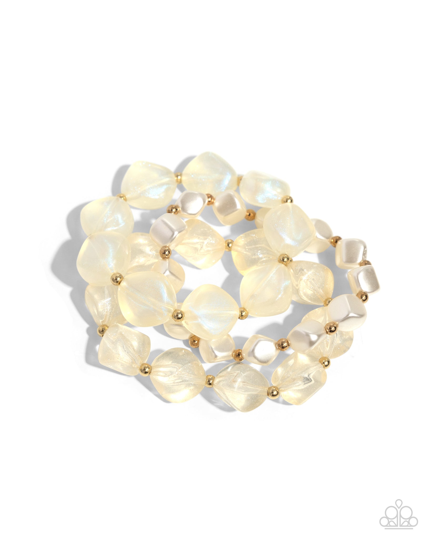 Cubed white pearls join a strand of clear acrylics and glittery acrylics that alternate with gold beads along elastic stretchy bands around the wrist for a sweet stack.