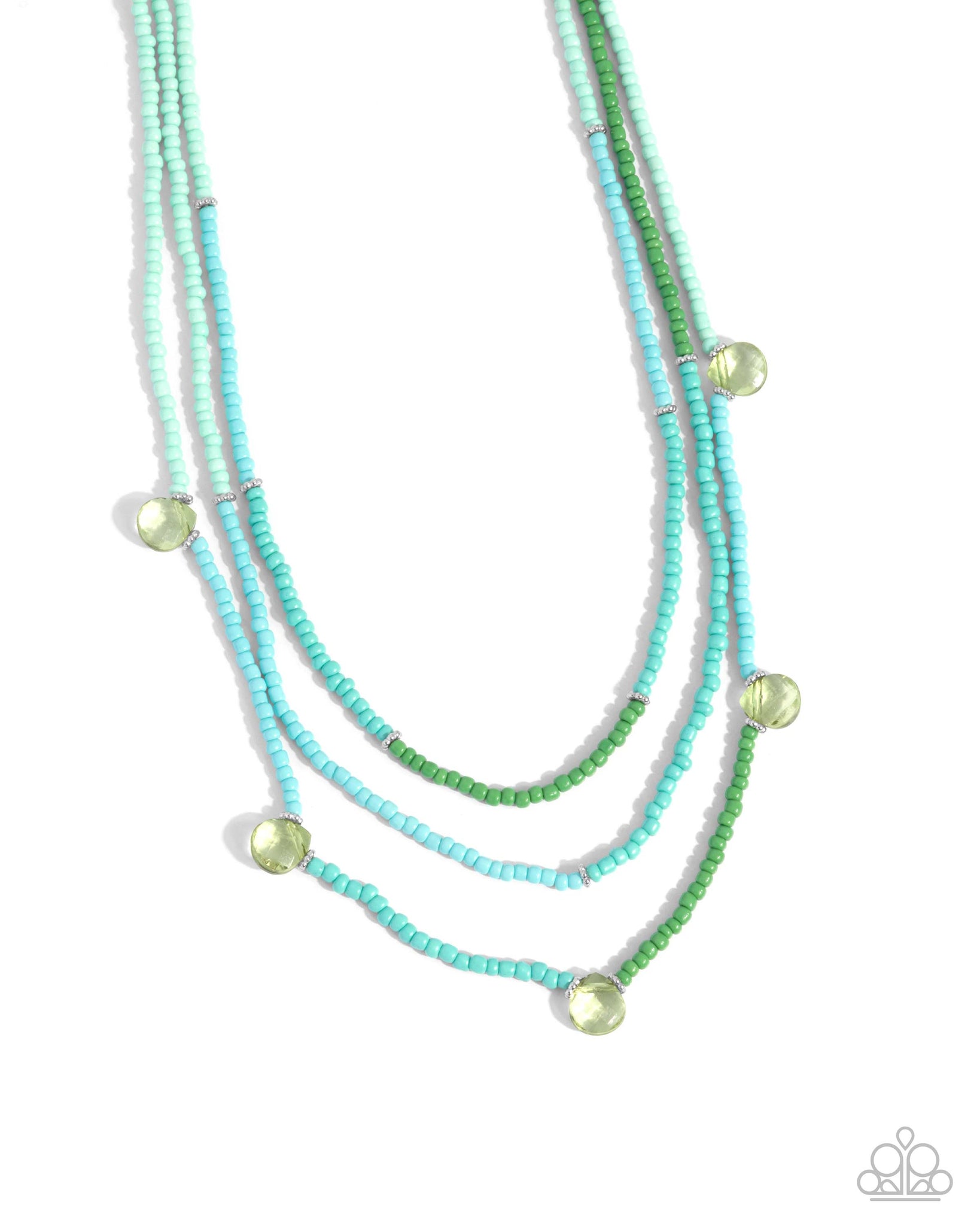 Infused along invisible strings, a collection of Fern, Arcadia, Limpet, Spearmint, and turquoise seed beads, silver wheel beads, and clear green teardrop beads layer below the neckline for an impressively colorful display. Features an adjustable clasp closure.
