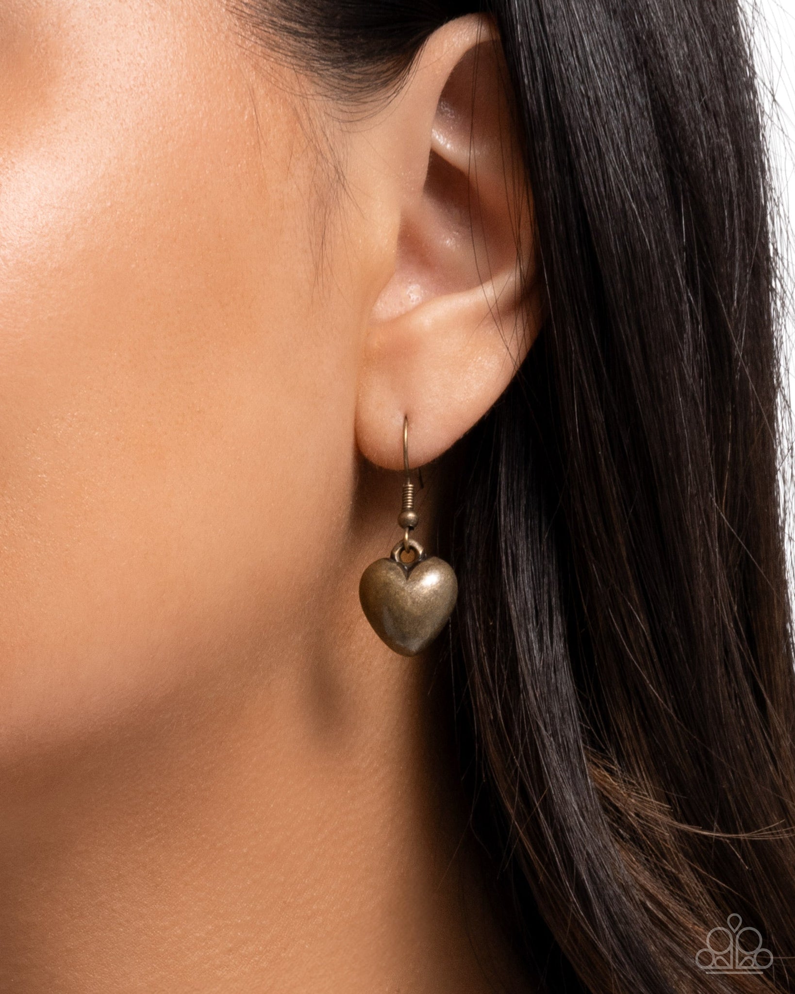 Infused with sleek brass hearts that gradually increase in size, tapered strands of brass chains sway and cluster from a thin oversized brass hoop, delicately extending into a heartfelt display at the bottom of an extended brass chain. Features an adjustable clasp closure.