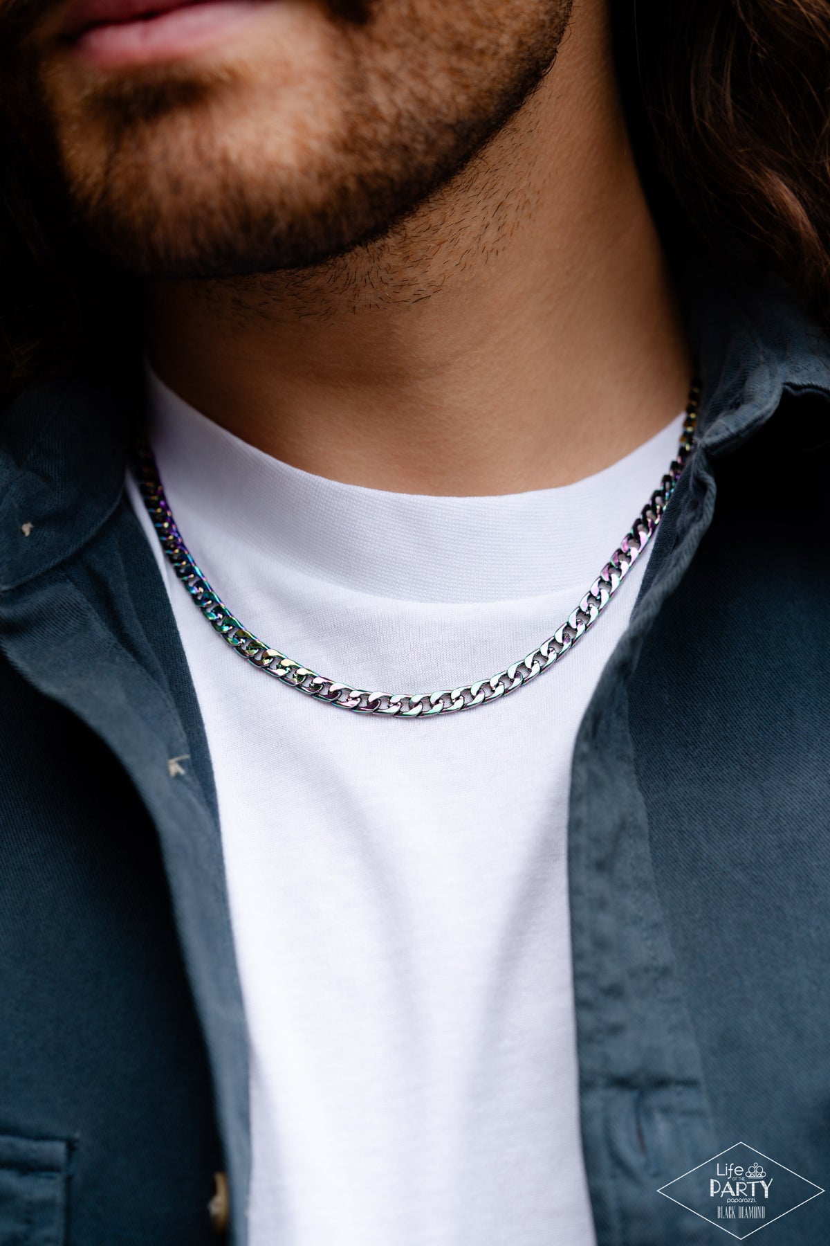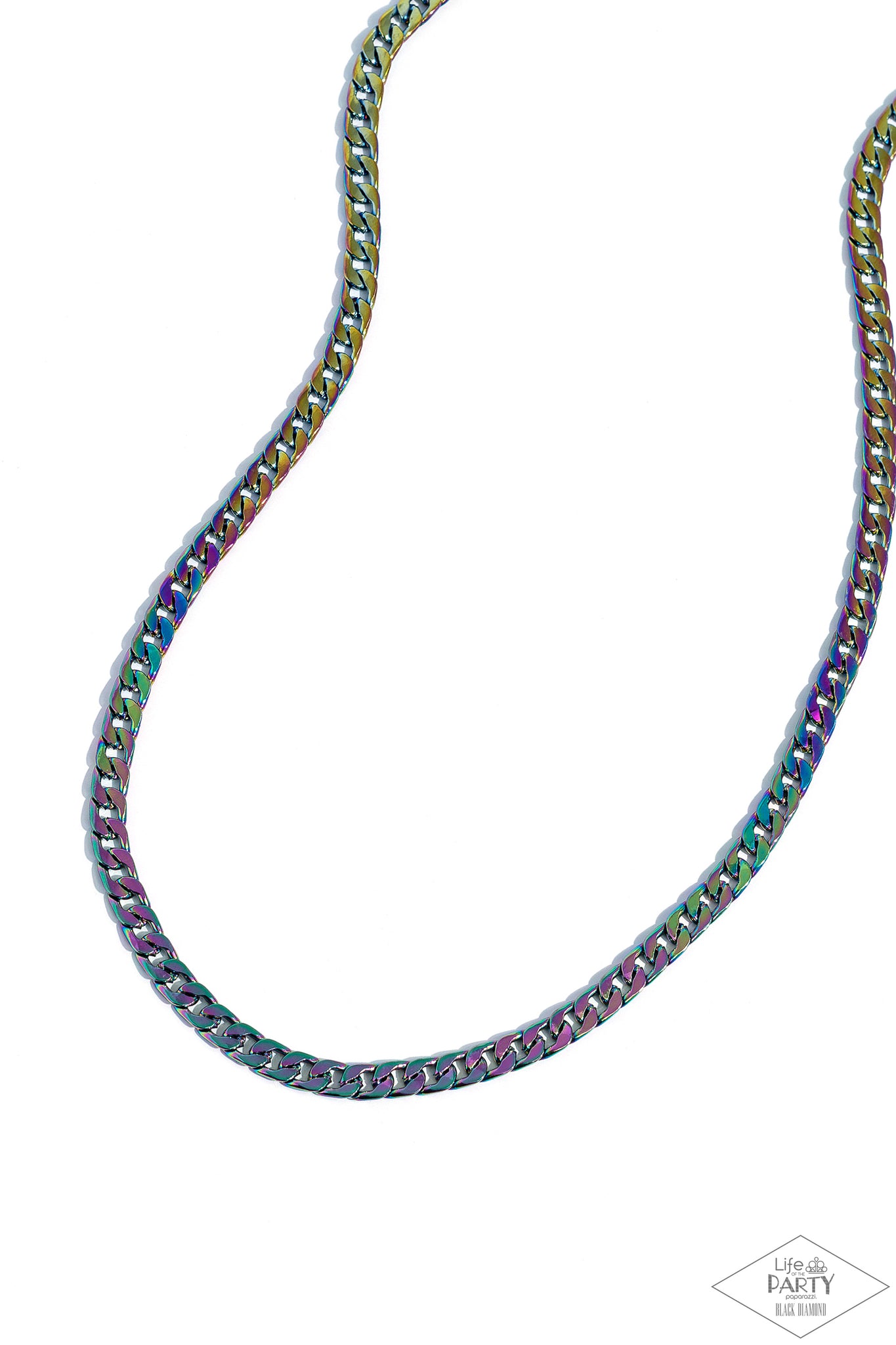 Featuring a flattened finish, oil spill links daringly interlock into a dainty curb-like chain across the chest for a stellar urban finish. Features an adjustable clasp closure.