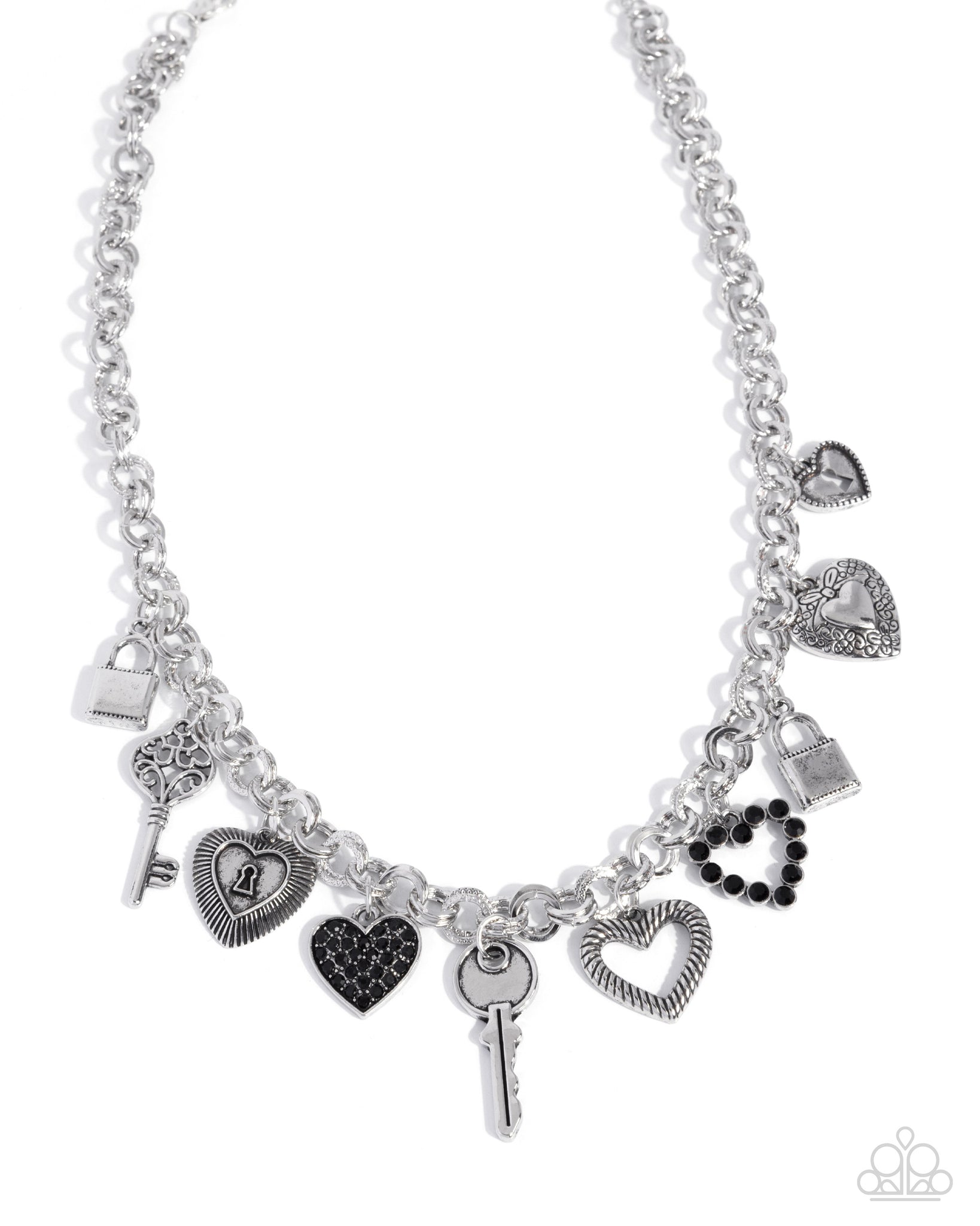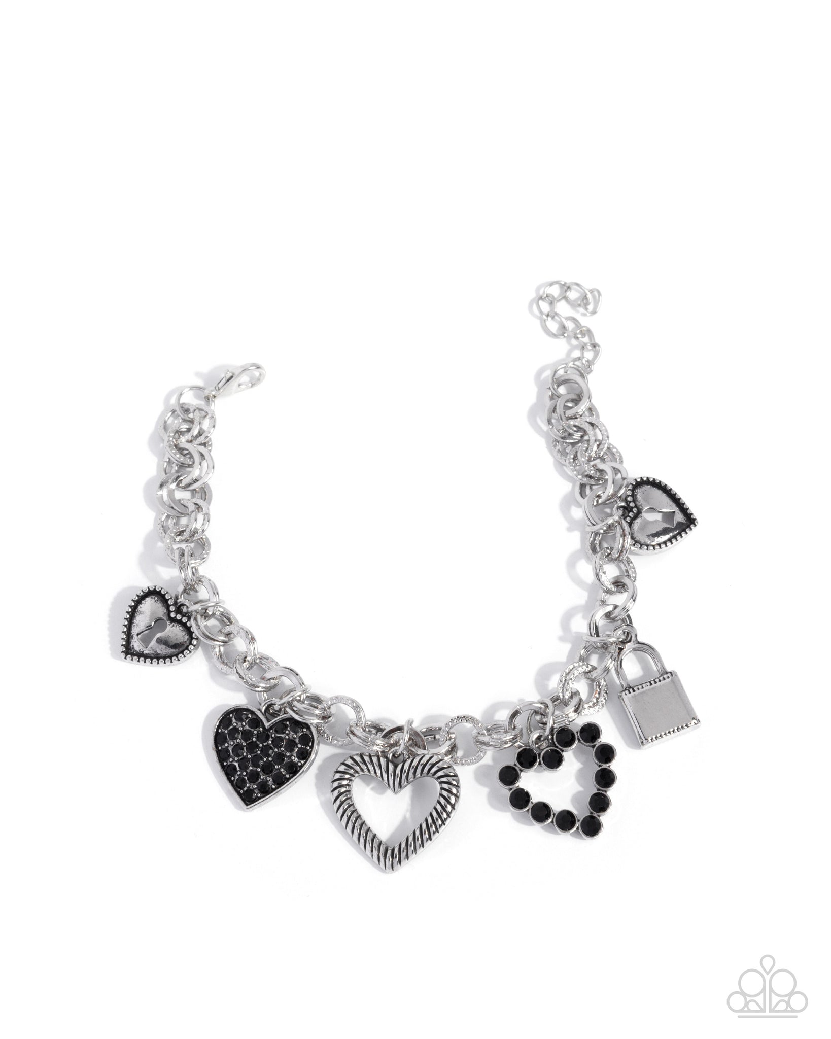 Dotted with black rhinestones, an assortment of romantic charms, including silver padlocks, and varying textured and high-sheen silver hearts, sway along an abstract, hammered, layered link chain for a vintage finish. Features an adjustable clasp closure.