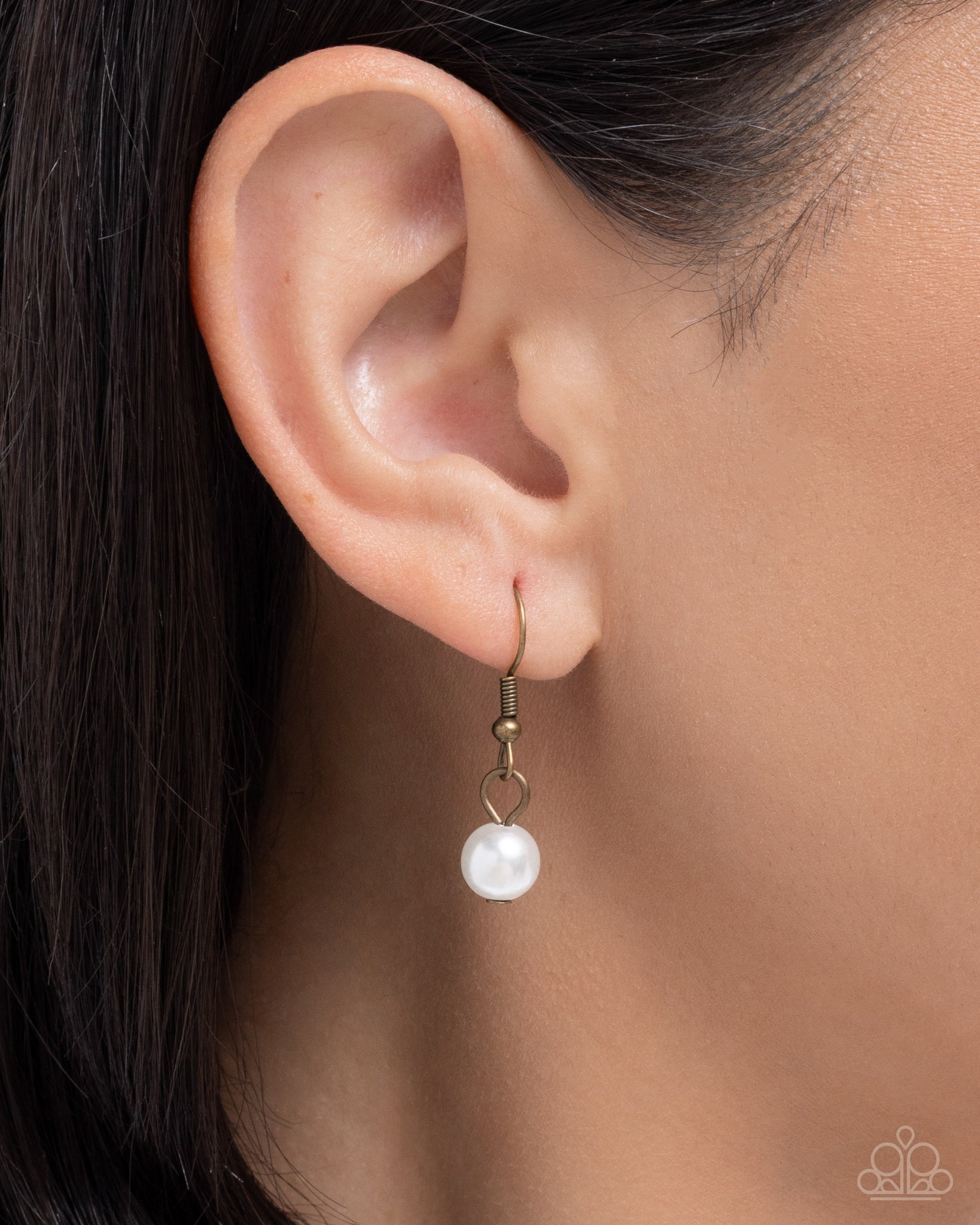 Detailed in curly filigree, an antiqued brass shield-like padlock pendant is centered along a brass cable chain while a glossy white pearl-dotted chain sways above it for a polished, persistent display. Features an adjustable clasp closure.