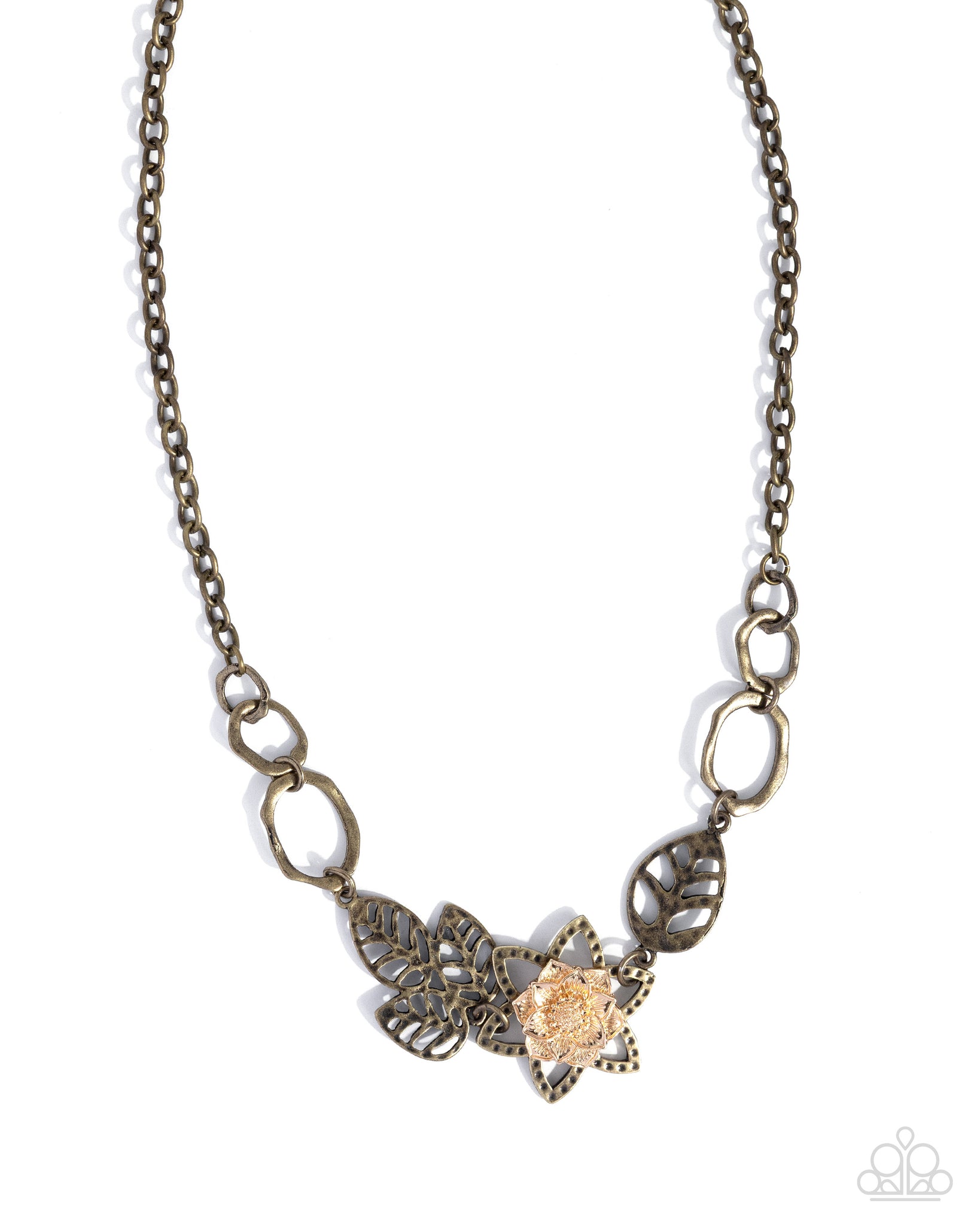 A classic brass chain gives way to varying sizes of hammered brass links, finally giving way to a trio of hammered brass leaves and flowers below the neckline for an eclectically earthy display. A three-dimensional gold flower blooms from the center of the hammered brass flower silhouette for a radiant finish. Features an adjustable clasp closure.