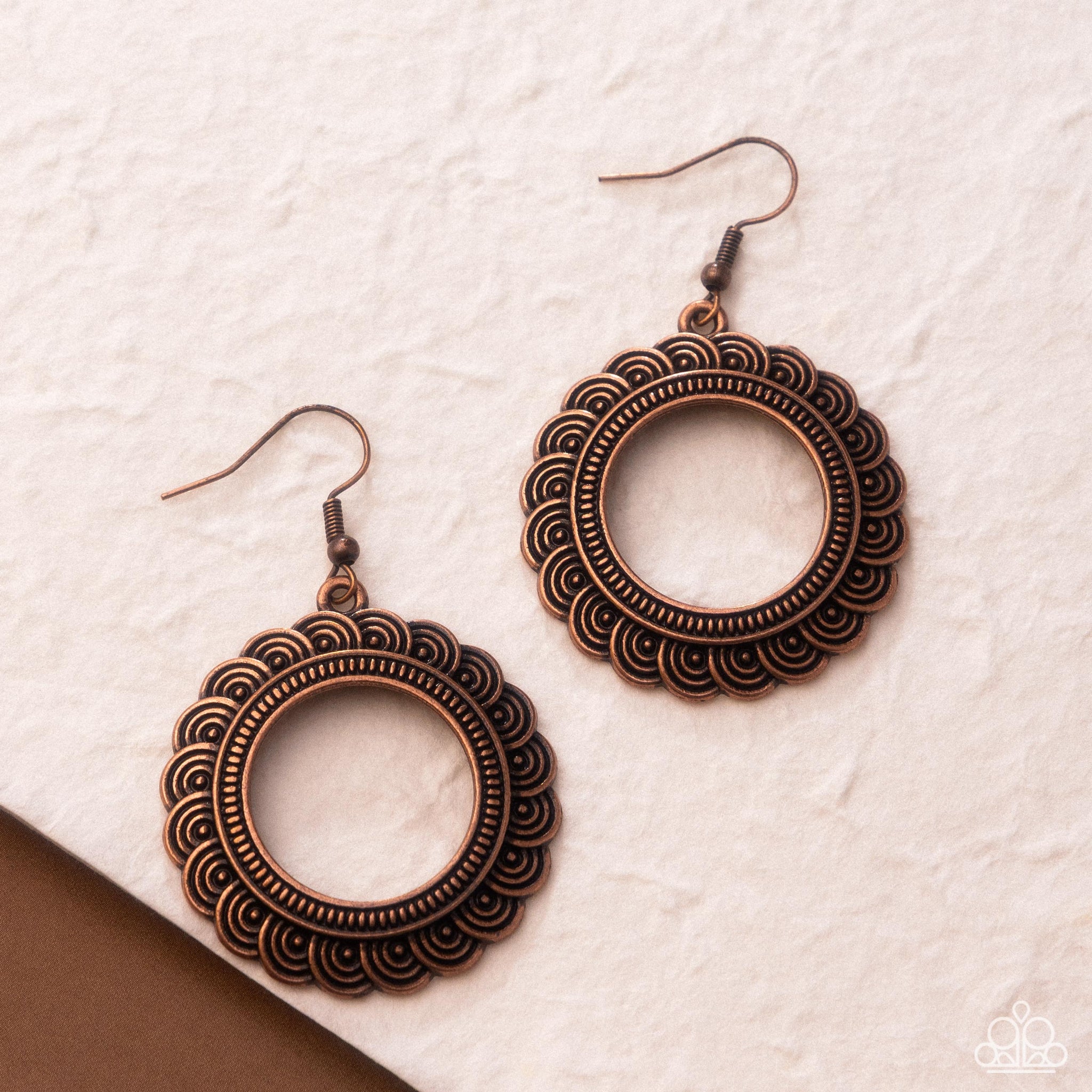 Swirling with circular textures, copper studded frames delicately overlap as they fan out from a textured copper hoop for a frilly artisan inspired flair. Earring attaches to a standard fishhook fitting.