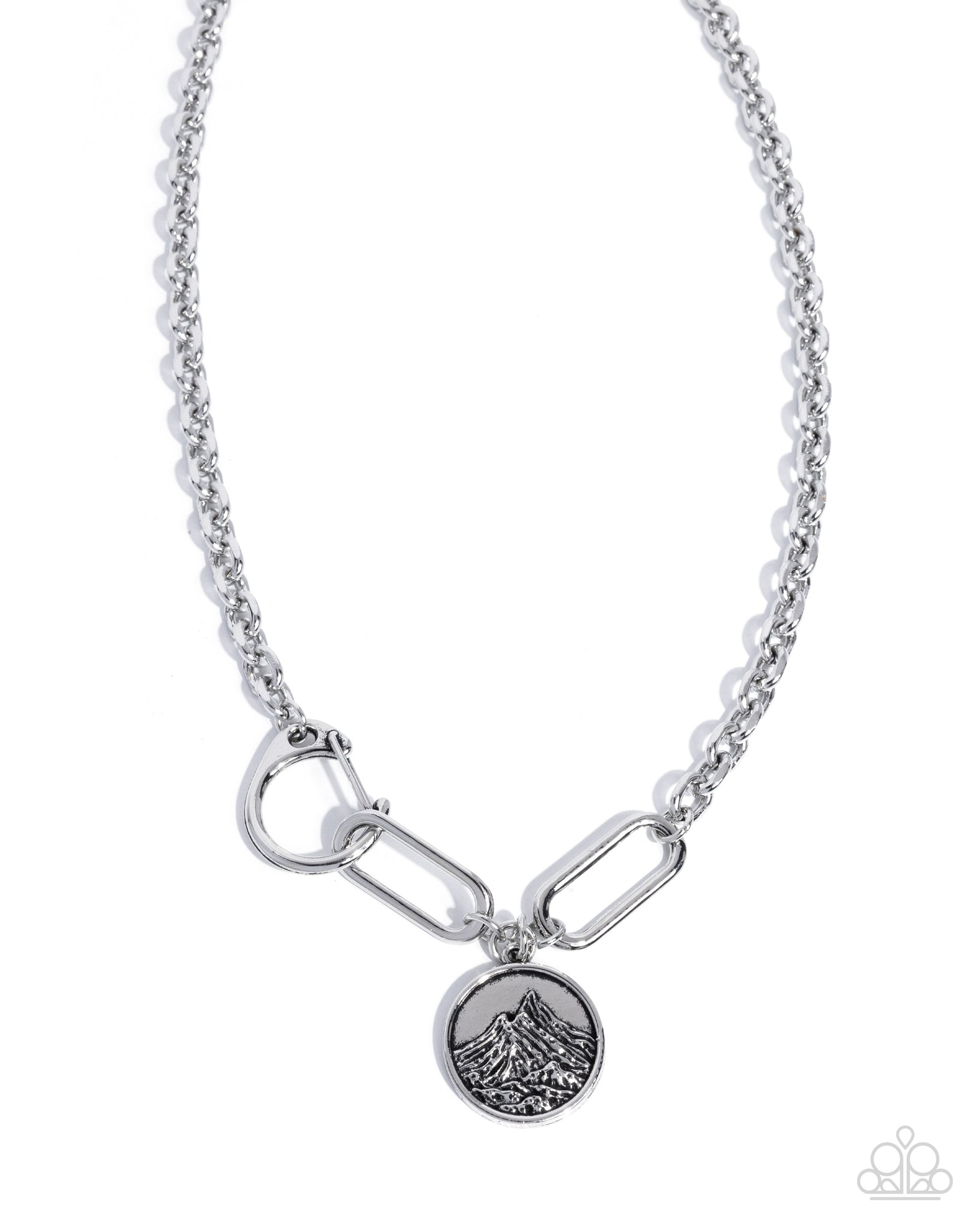 Featuring an abstract silver chain that connects to elongated silver links, a mountain landscape-embedded silver disc sways below the neckline for a rustically radiant look. Features a clasp closure.