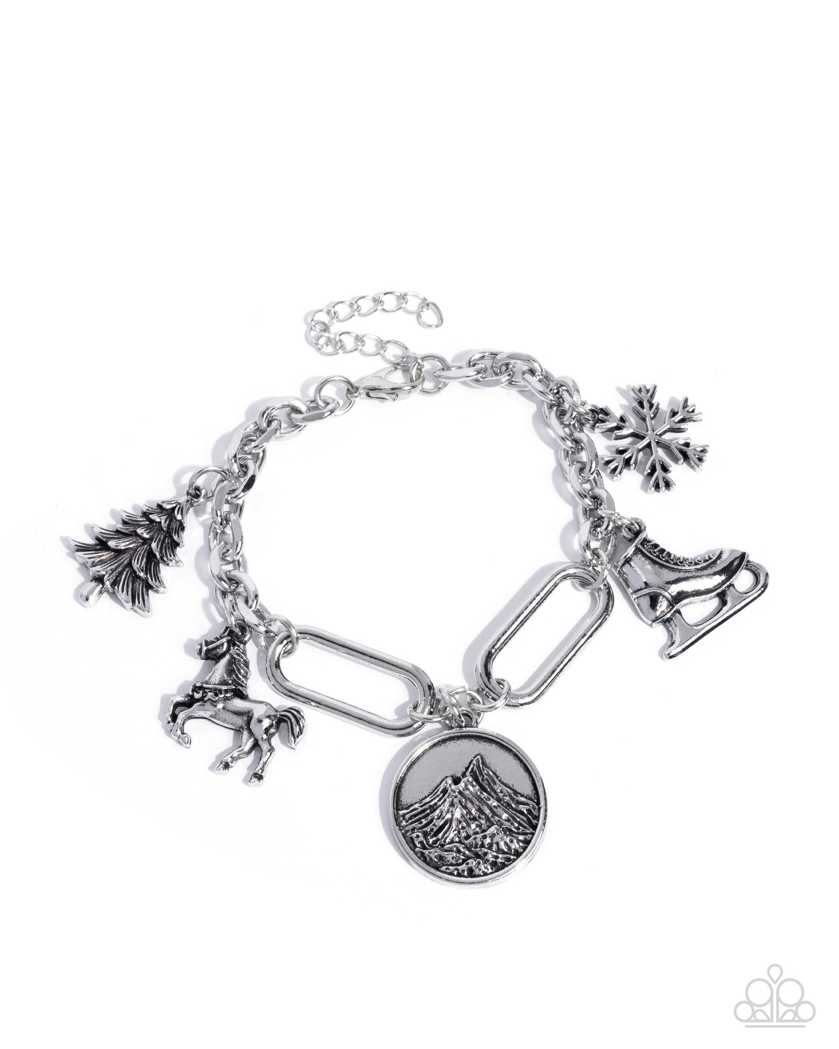 Featuring an abstract silver chain that connects to elongated silver links, a collection of mountain-inspired charms including a pine tree, a wild stallion, a snowflake, an ice skate, and a mountain-embedded silver disc sways along the wrist for a rustically radiant look. Features a clasp closure.