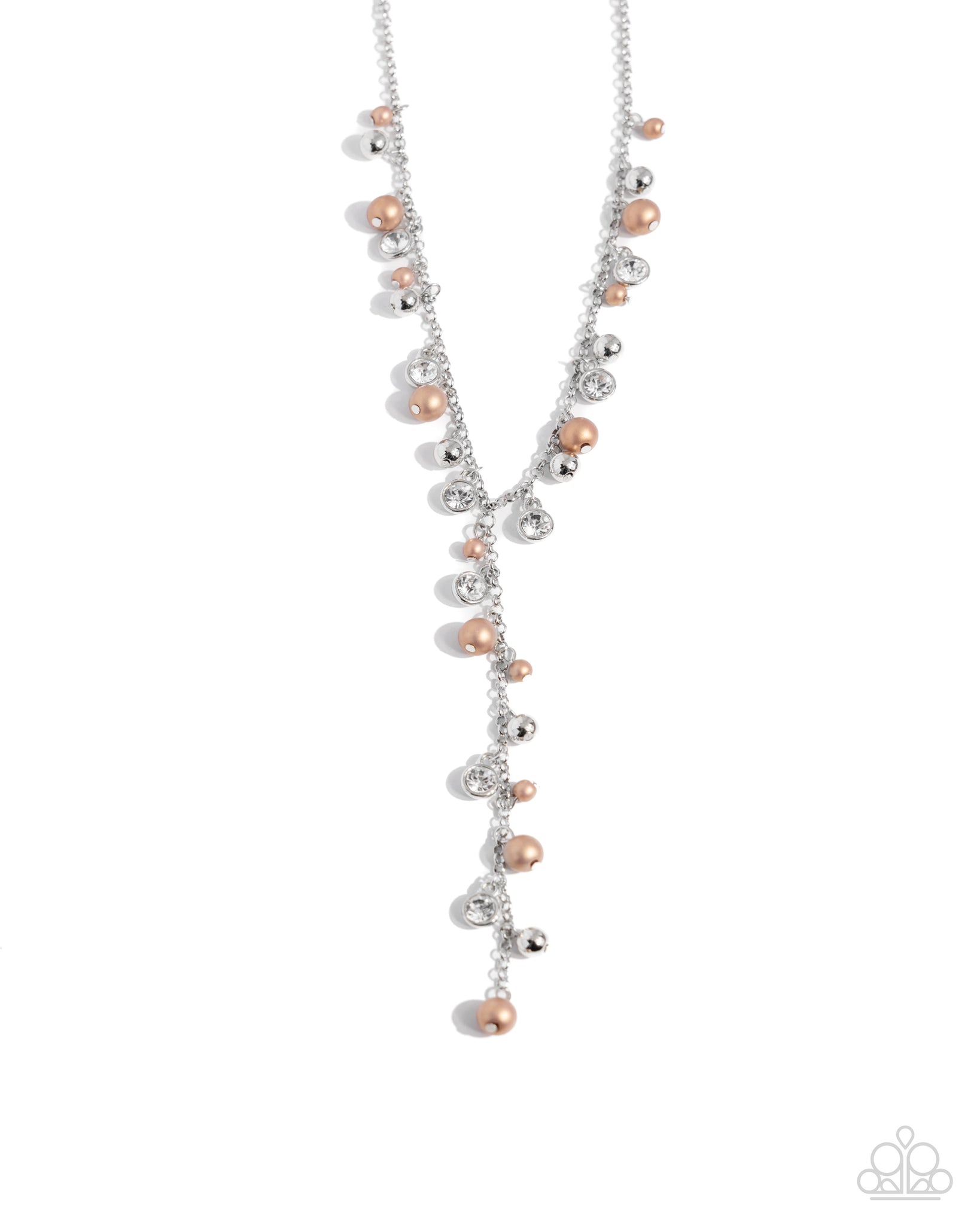 Dancing along an extended silver chain, a collection of Brush pearls, silver beads, and white rhinestones in silver fittings cascade down the chest for a notably noble array. Features an adjustable clasp closure.
