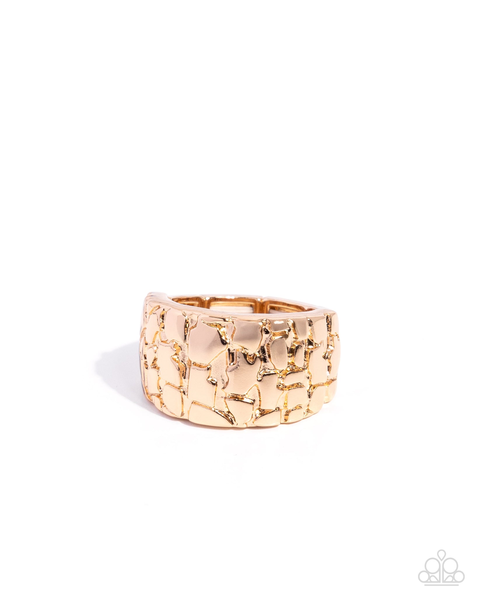 Featuring highly reflective, abstract gold pebbles in varying sizes and shapes, a thick gold band loops along the finger for a prehistoric-inspired look. Features a stretchy band for a flexible fit.