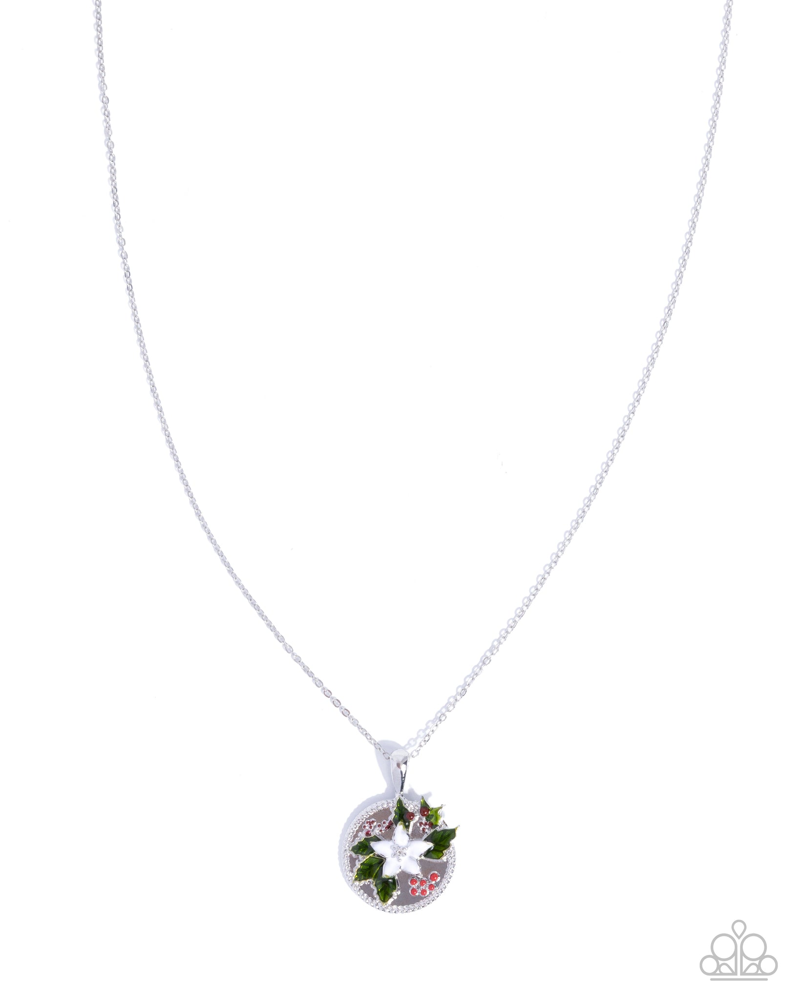 Gliding along a dainty silver chain, a twist-textured silver pendant embellished with poinsettia green-painted leaves, a silver-studded white-painted flower, and red-painted cranberries coalesces below the neckline for a Christmas-inspired display. Features an adjustable clasp closure.